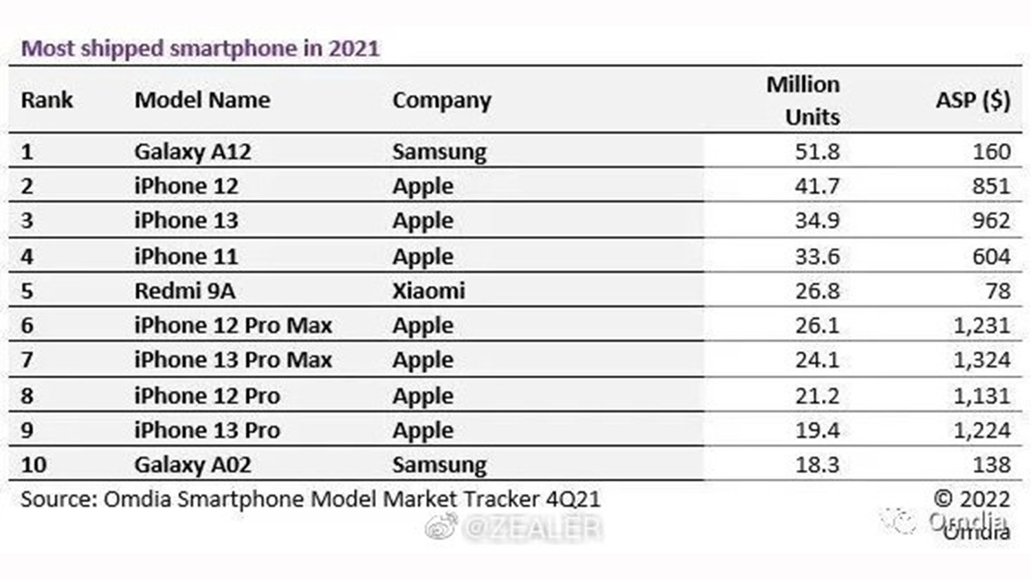 今回の情報によると市場調査会社であるOmdiaが2021年第4四半期のグローバル市場/モデル別の売上ランキングを公開したとしています。上記の画像からも圧倒的に1位なのがGalaxy A12。2位のiPhone 12と比較しても1000万台以上売れています。