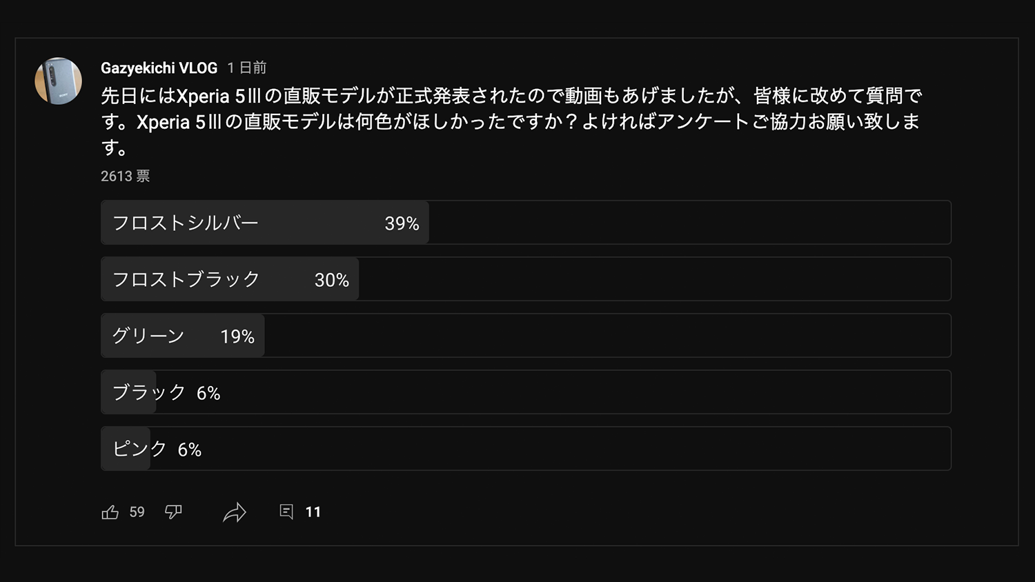 なので自分のチャンネルでアンケートをとってみましたが途中経過とはいえ状況の画像からも限定カラバリを待望していたユーザーが多い。なのでコメントでも限定色がなく購入を見送るとしている人が多数という感じ。