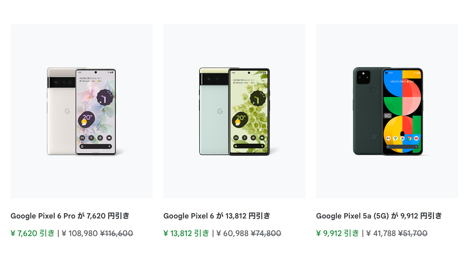 今回Google Storeがゴールデンウィークセールを開始しており、Google Pixel 6シリーズに加えPixel 5aが値引きで販売されています。特にインパクトが大きく感じるのがPixel 6の僅か6万円とPixel 5aの約4万2000円。