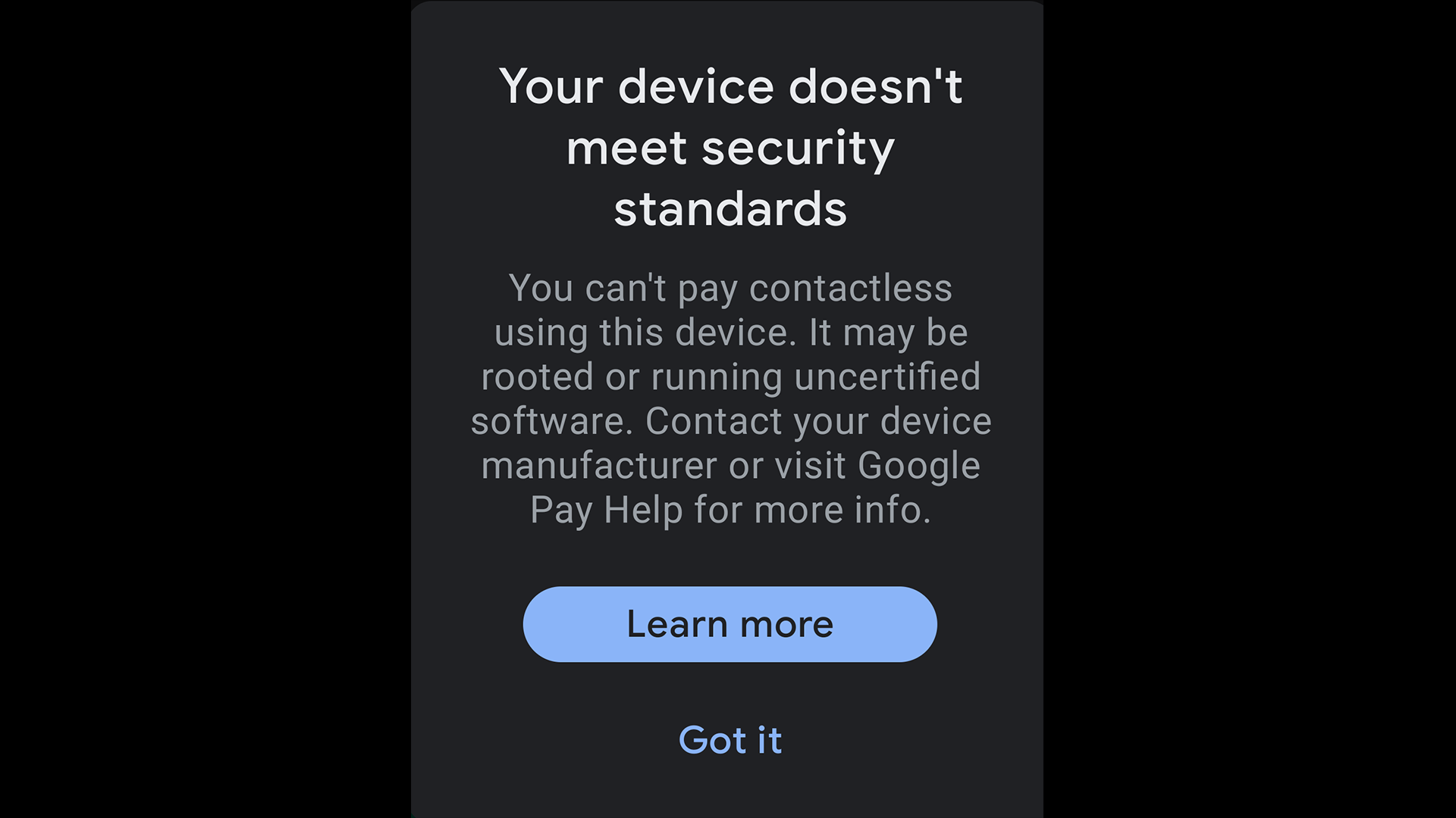 日本でいうおサイフケータイ機能が決済はできるけどアプリを表示する度に上記の警告が表示されるとしています。セキュリティの問題から使えないと。今回の投稿にあるようにアップデート自体は最新のものにしているとしています。