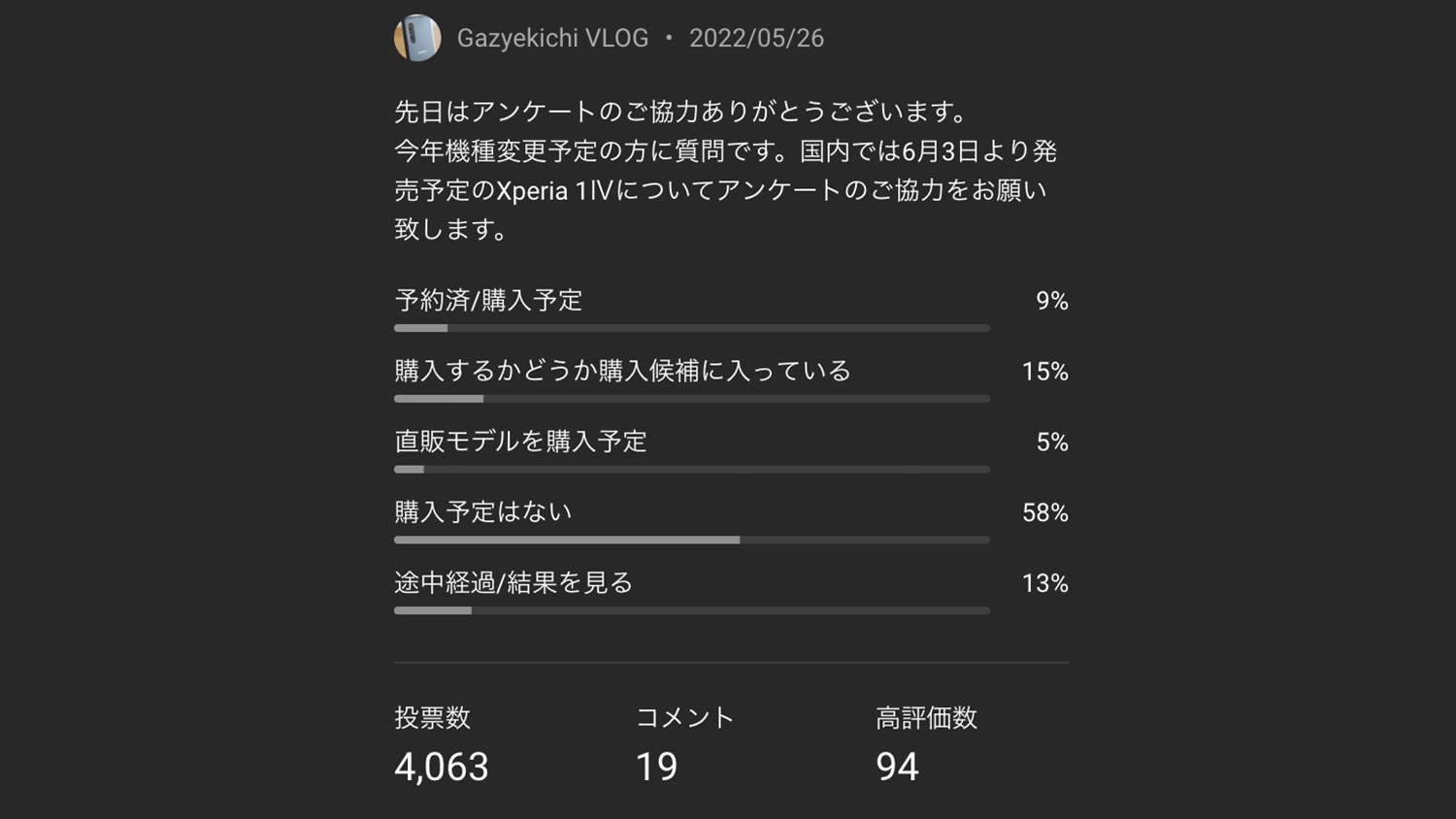 今回自分のチャンネルでXperia 1Ⅳの購入意欲アンケートをとった結果が上記の画像になります。自分のチャンネルはXperiaが好きな方が多くチャンネル登録をして頂いているのでXperiaに対してポジティブな方が多いと思います。