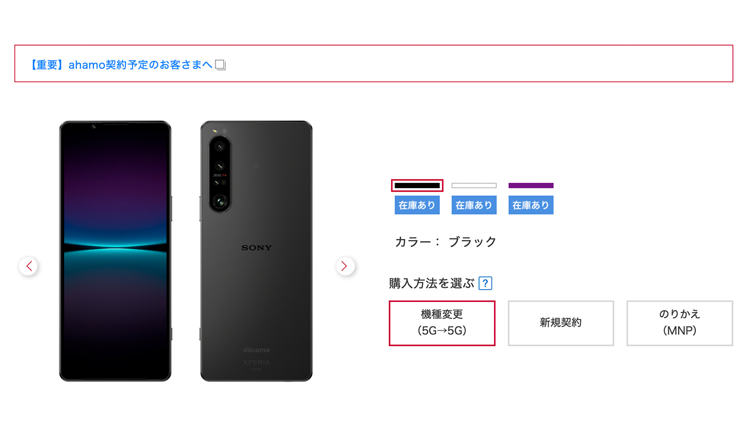 またdocomoオンラインショップを確認するとXperia 1Ⅳは全色在庫ありの状態となっています。5月31日より購入手続きが可能になったので予約をしていたユーザーに対しては入荷連絡がきていると思います。