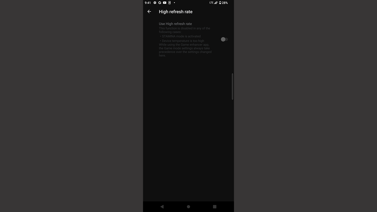 今回投稿されている画像を併せて確認すると120Hz表示がオンに出来ない理由としてスタミナモードがオンになっていないか?ざっくり言えば本体が過熱していないかの表示を確認できます。
