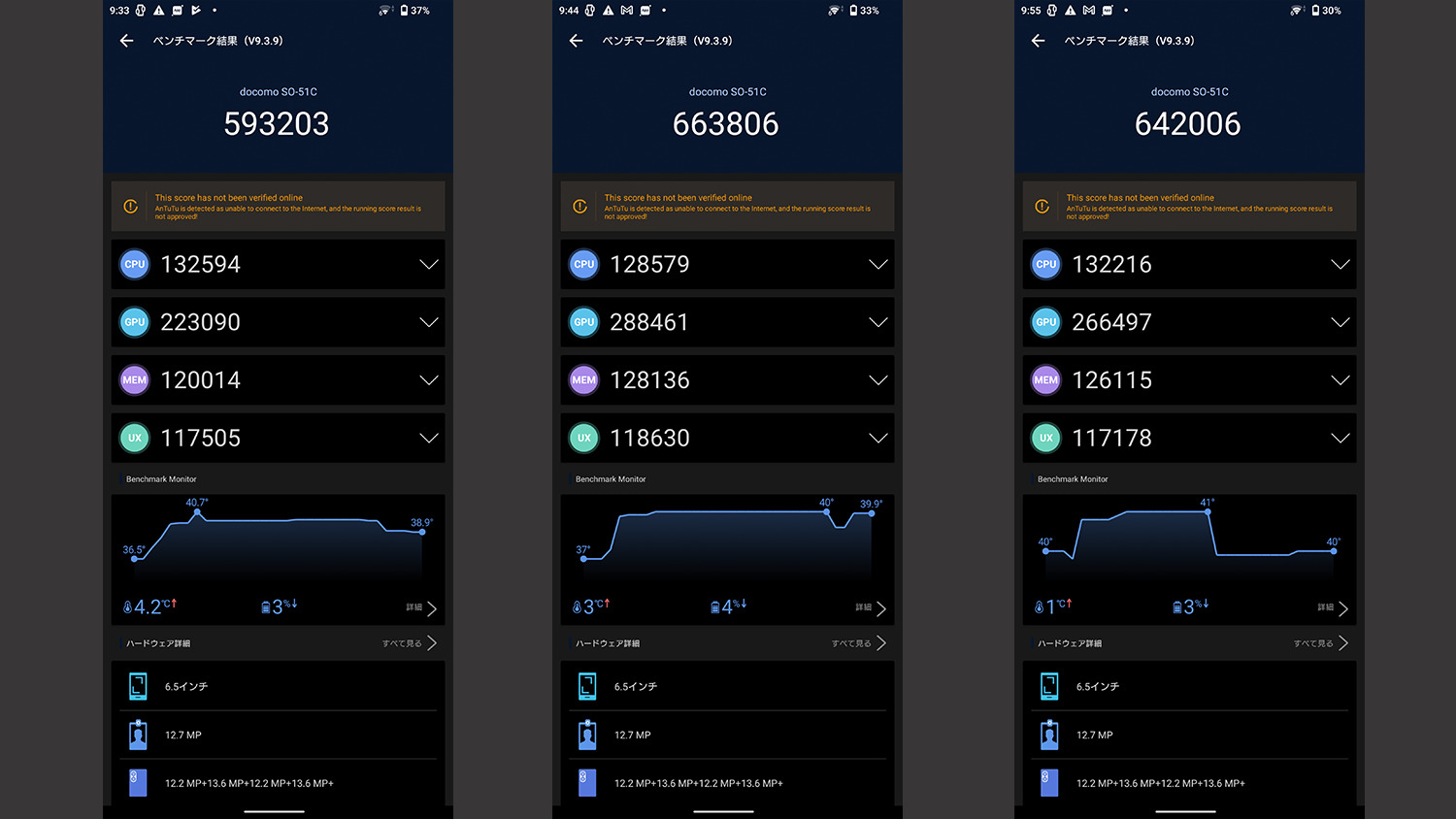 今回発売されたばかりもあるのかベンチマークアプリが正常に動いておらずスコアが60万点と本来のパフォーマンスは出ていません。ただ3回目でようやく内部温度が41度という感じでSnapdragon888搭載機種と比較するとマシ。