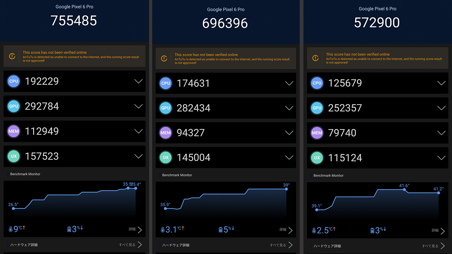 そして搭載SoCに関してPixel 6 ProはるGoogle TensorでXperia 1ⅣはSnapdragon 8 Gen 1を搭載。発熱を調べるためにベンチマークを3回連続で回してみました。