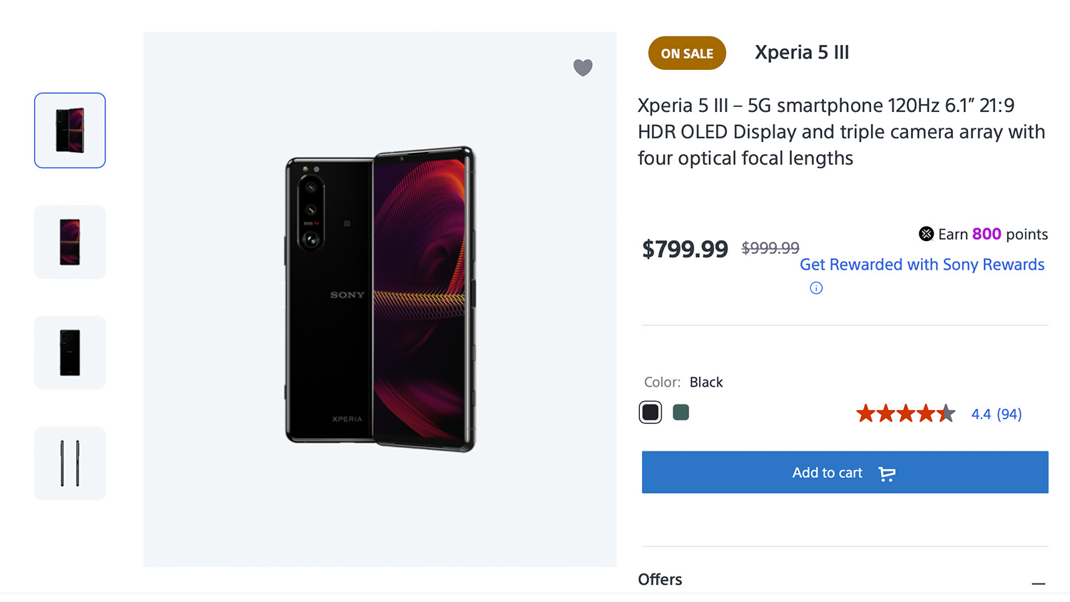 執筆時点における米Sony StoreにおけるXperia 5Ⅲの製品ページが上記の画像になります。セール中となっており$200の値下げとなっています。アメリカで見ればiPhone 13などと同じ価格帯なので割とインパクトがあります。