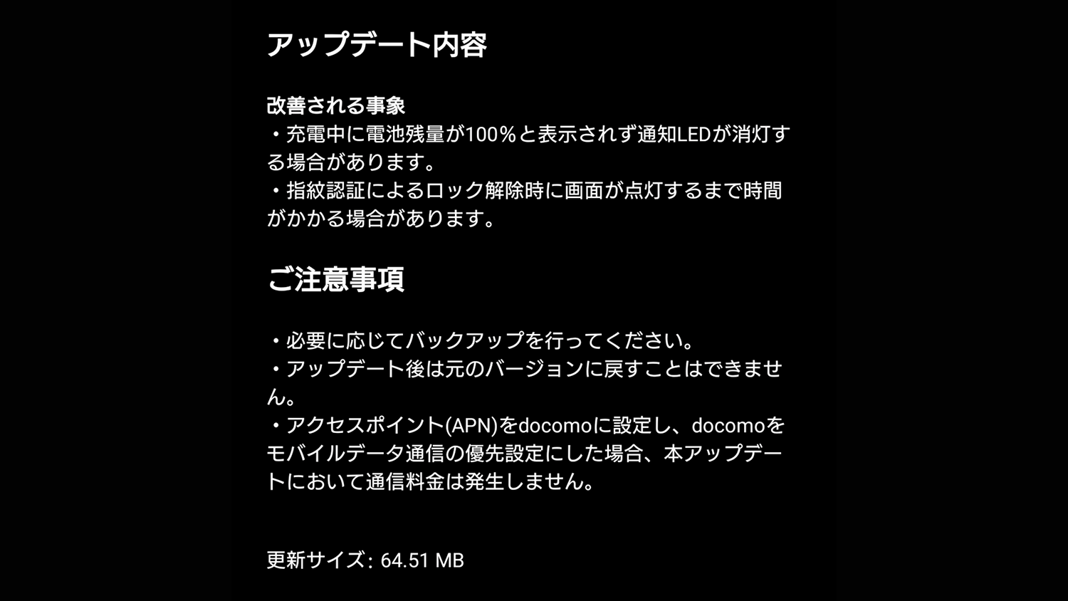 今回手持ちのdocomo版に対して最新のアップデートが配信されていることが判明。修正内容としては大きく2つとなっており、自分の手持ちでは1個目の修正内容はもともと不具合が発生していなかったので変化なし。