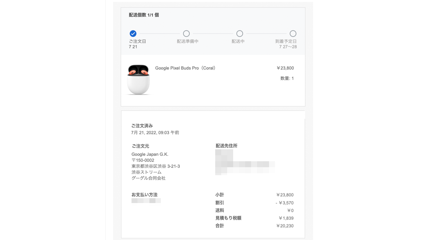 午後確認したところ問題なくPixel Buds A seriesもカートに合わせて追加可能になっており、配送日も執筆時点で7月28日になっていることを確認することができました。予約開始当初はシステムがめちゃくちゃだったみたいです。