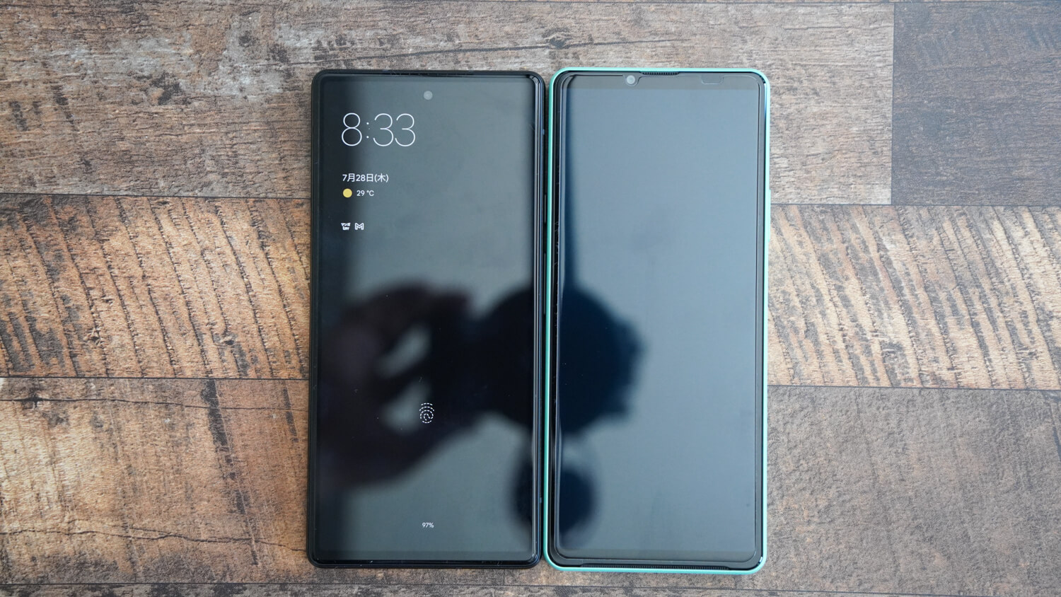 また縦幅にそこまでの差がありませんが横幅に関しては4.8mmの差があるため圧倒的にXperia 10Ⅳの方が片手操作がしやすい。