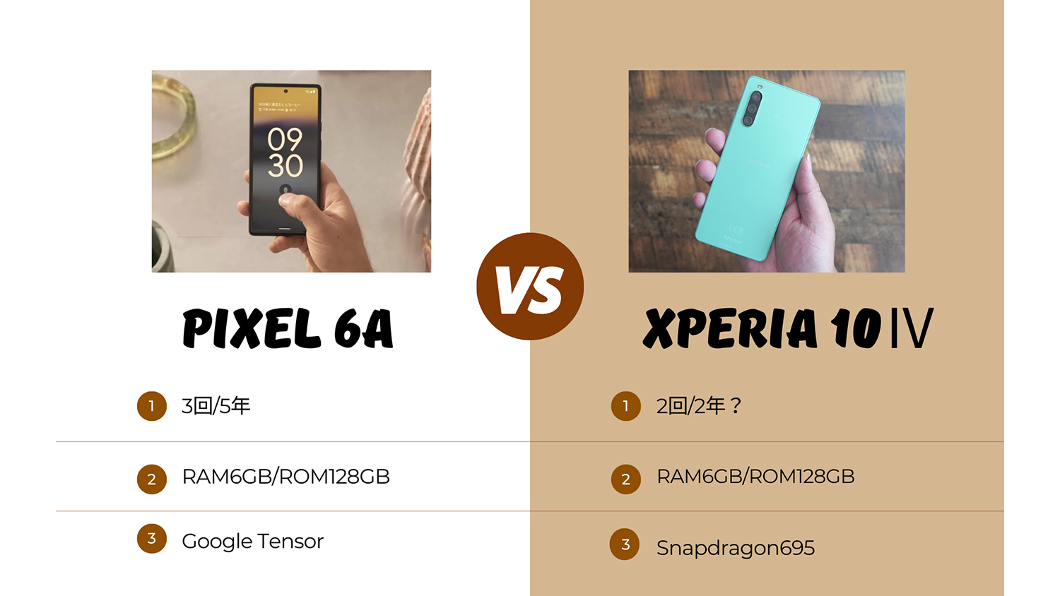 常にセキュリティ含め最新の状態にしておきたいユーザーや少しでも長く安心して使いたいユーザーはこの時点でPixel 6a一択になります。RAM6GB/ROM128GBは共通でXperia 10ⅣのみSDカード対応。