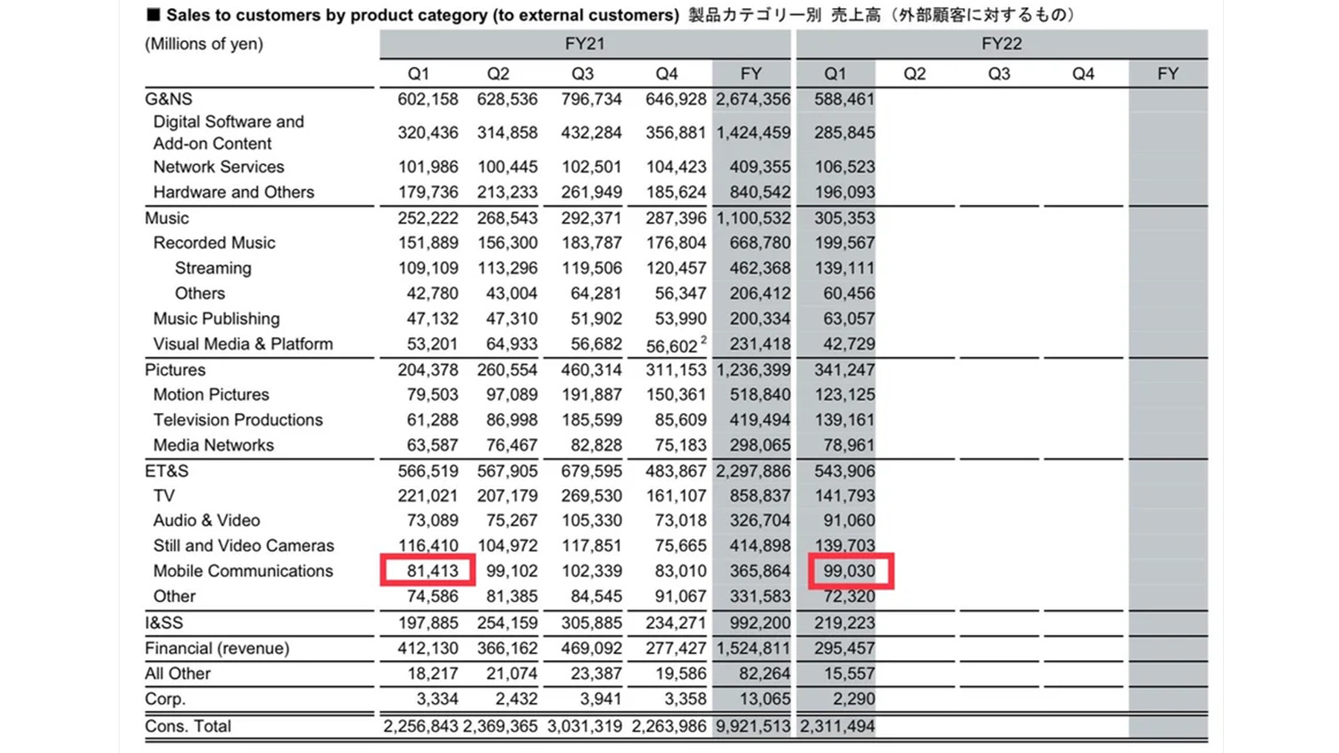 そして上記の画像が添付されていた感じです。確かに前年対比でモバイル部門の売上が増加。Sonyの決算は4月から6月で第1四半期だったと思うので売上増加につながった要因として考えられるのがXperia 1Ⅳの発売。