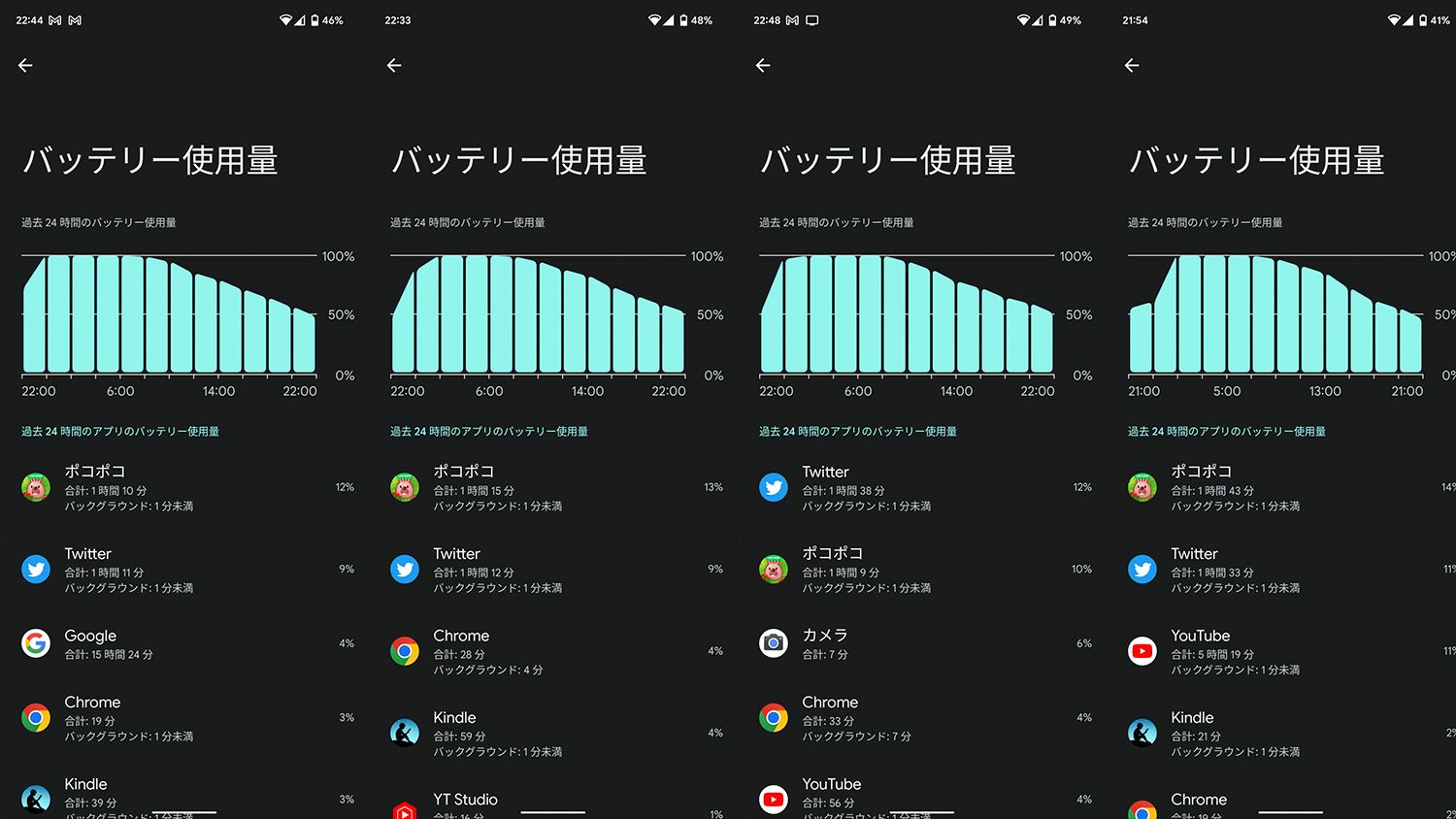 ちなみに手持ちで判断するとPixel 6 ProやPixel 6は1日の終わりの電池残量が40%前後でXperia 1Ⅳが45%前後でXperia 5Ⅲが60%前後という感じで海外サイトの評価がかなり厳し目でかなり電池持ちに警戒していたこともありますがここまで安定していれば個人的には十分です。