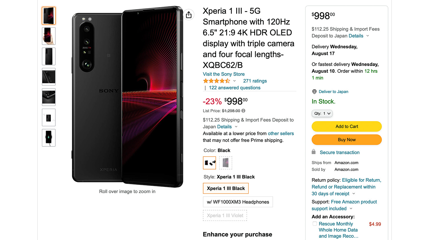 今回の情報によると米AmazonにおいてXperia 1Ⅲが過去最低価格で販売されていることが判明したとしています。定価は$1298となっていることからも$300と大幅値引きとなっています。