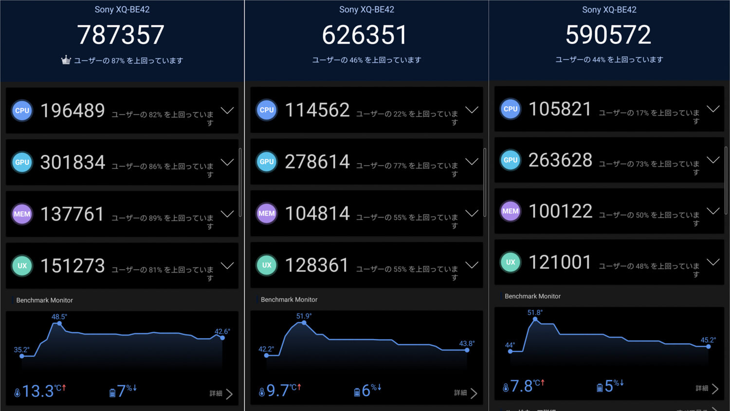 なので同世代のXperia 1ⅢやXperia 5Ⅲと違う仕様です。またベンチマークで負荷をかけるとXperia 1Ⅲは43度くらいでXperia 5Ⅲは40度くらいに対してXperia PRO-Iは50度を超えることがあるので正直不安に感じます。