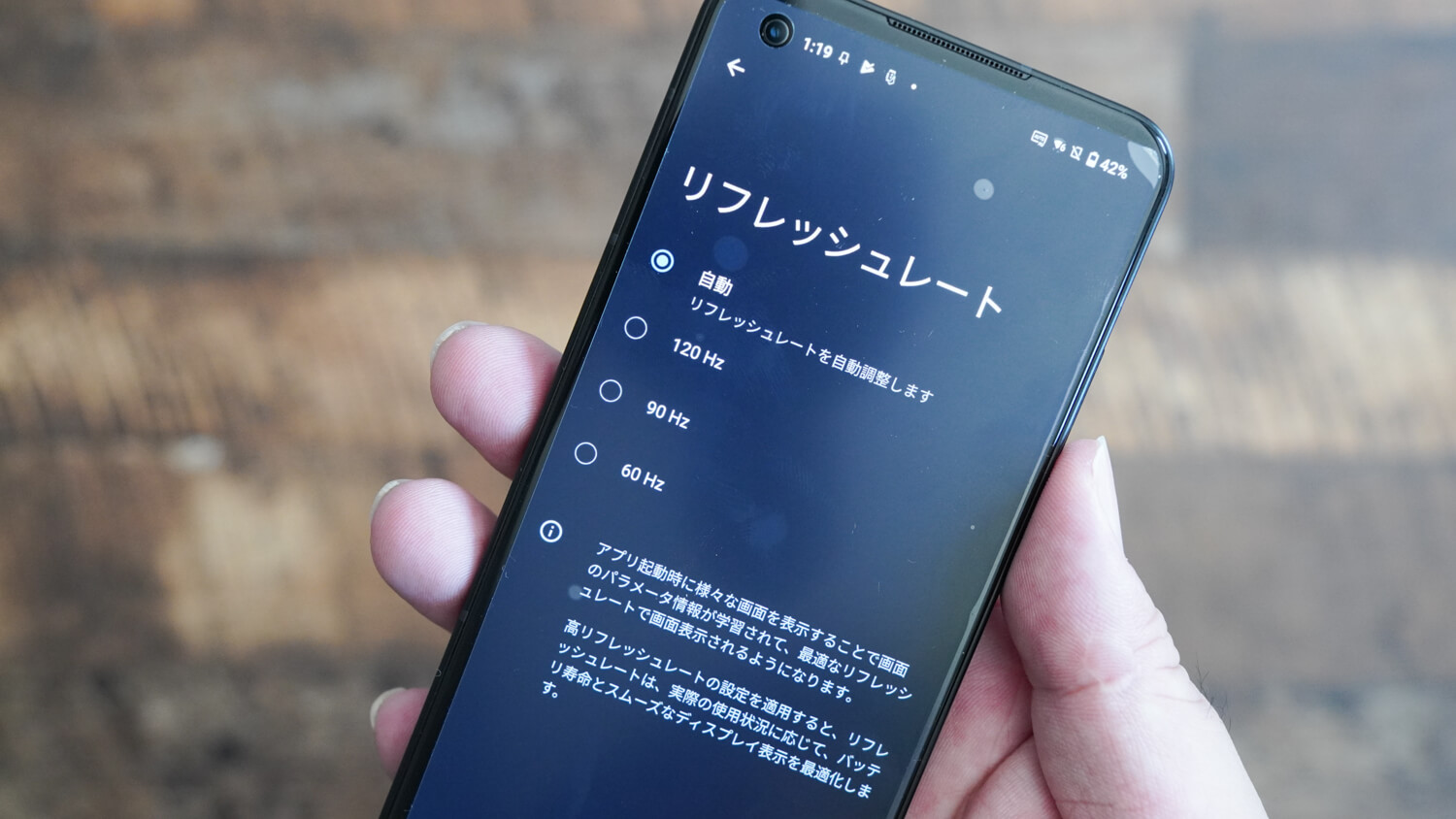 ただ個人的にはベゼルの太さは全然気にならない感じ。5.9インチで表示解像度はFHD+なので十分。また最大120Hz表示に対応していますが流行りの可変式ではなくユーザーが任意で設定可能です。