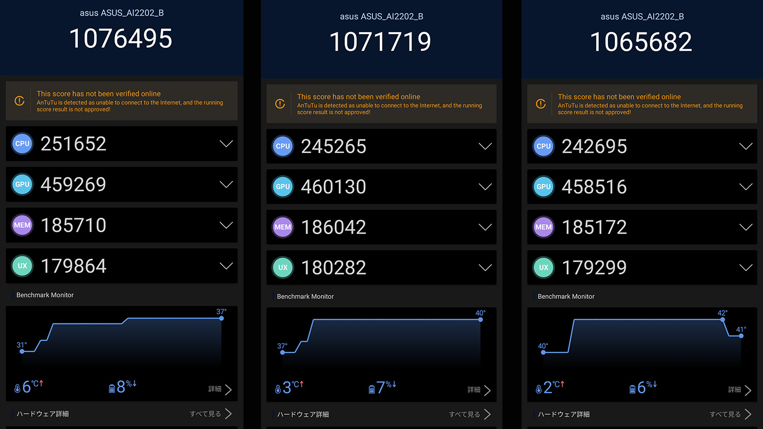 期待値が高かったせいか発熱がひどく感じます。Zenfone 9はハイパフォーマンスモードとダイナミックモードの2種類が存在しておりスコアも違います。ハイパフォーマンスモードは100万点前後に対してダイナミックモードは80万点前後という感じ。