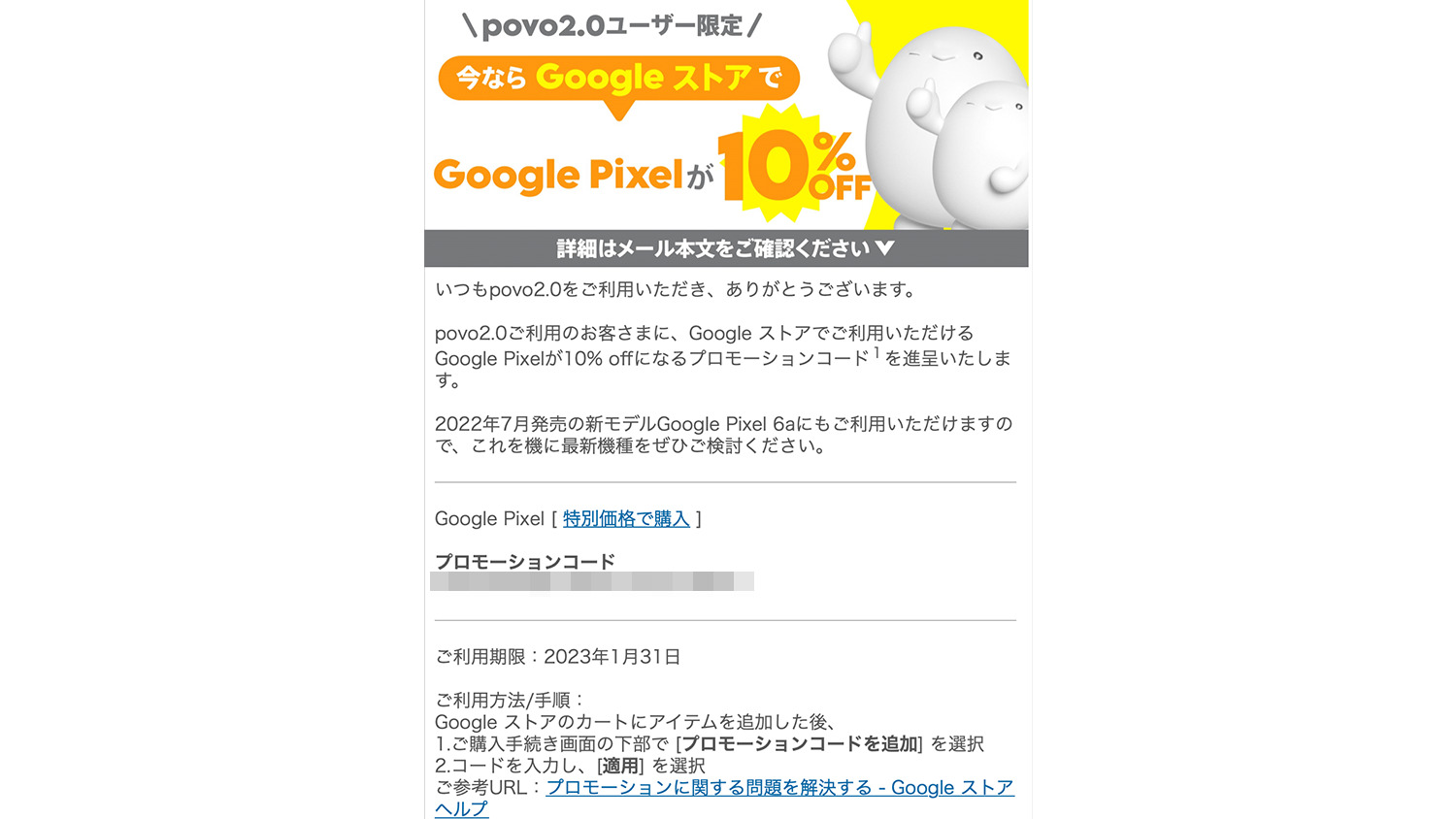数日前より一部ユーザーに対して配布していることは把握していましたが今回povo2.0契約者に対してGoogle StoreでPixelが10%の割引になるクーポンがようやく自分の手元にも届きました。