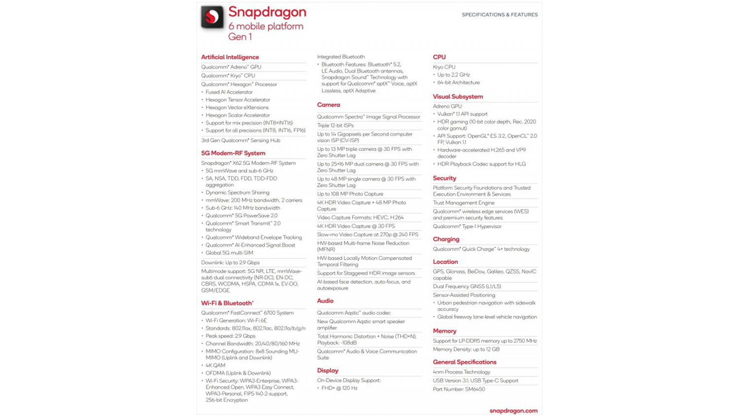 今回の情報によると廉価モデルに搭載される可能性があるSnapdragon 6 Gen 1の大方のスペックが判明したとしています。最大で2.2Ghzで動作するKryo CPUで構成されていることは確認できますがコア数などは不明。
