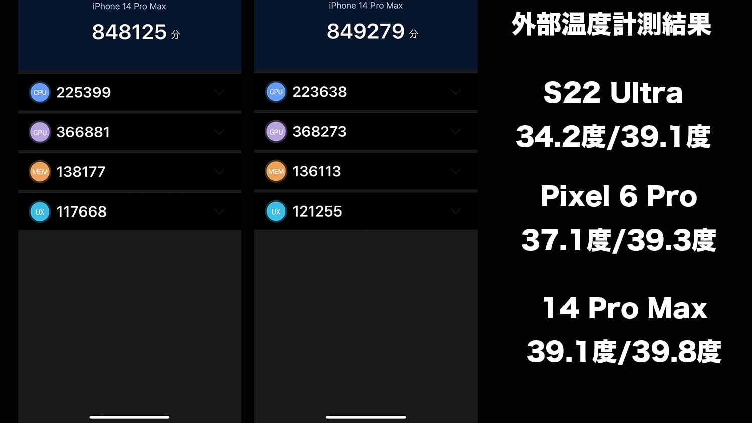 Android用だと内部温度も確認できますがiPhone用は確認できないので1回の計測が終わるごとに本体を触って一番熱いところを計測すると今回のテストではiPhone 14 Pro Maxが一番熱くGalaxy S22 Ultraがまだマシという感じでした。