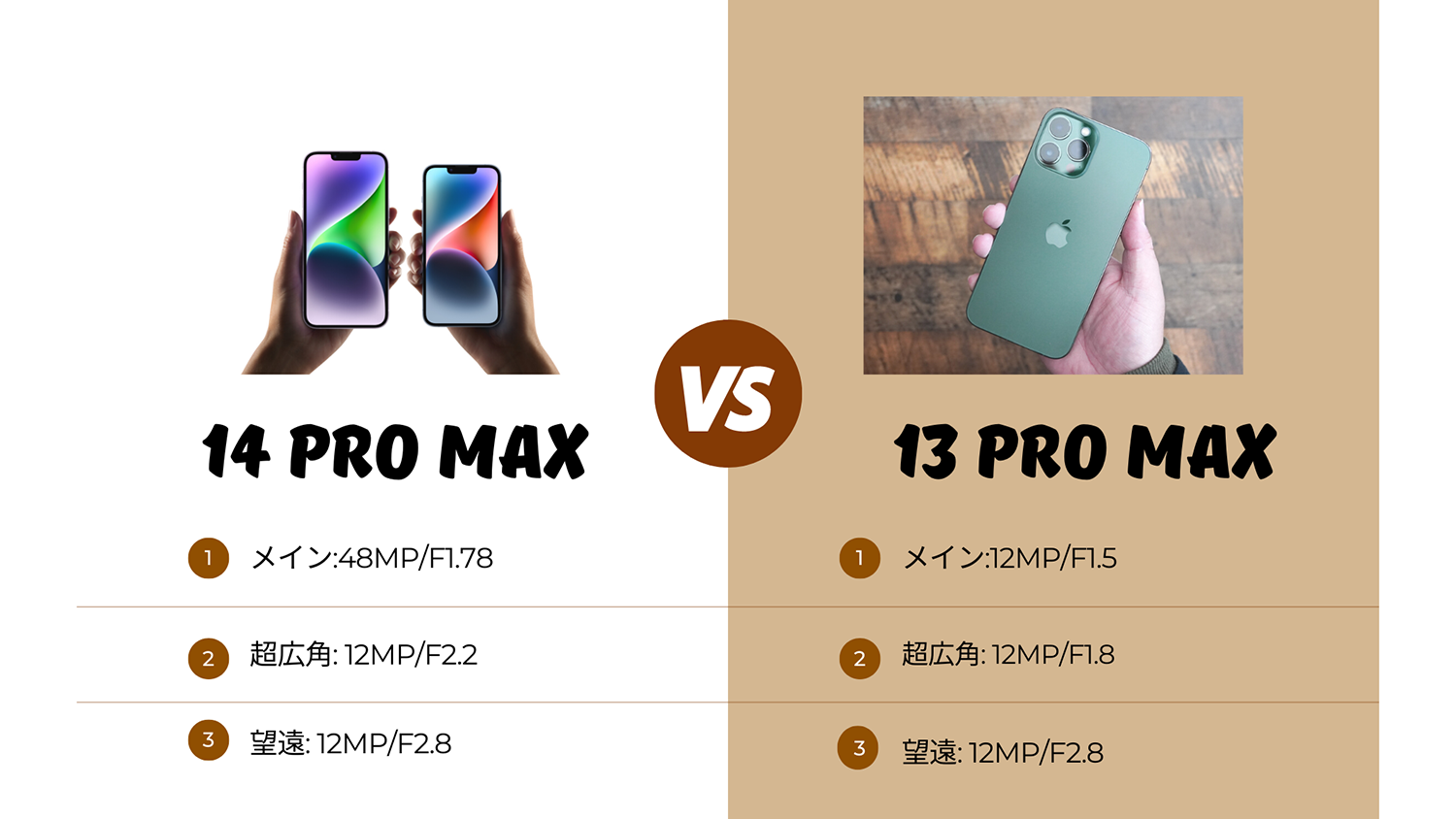 そして最後にカメラを確認していきたいと思います。大きな違いを確認するとメインカメラセンサーの画素数がiPhone 6s以来の変更で48MPに高画素化。ちなみに8K撮影に対応したわけではなく最大は4Kまでです。