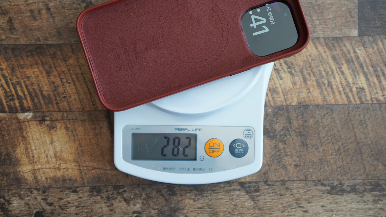 また先ほどご紹介したSpigenのガラスフィルムと純正のレザーケースを装着するとトータルで重さは280オーバーと重量級。もちろんケースによっては軽くも重くもなるという感じです。