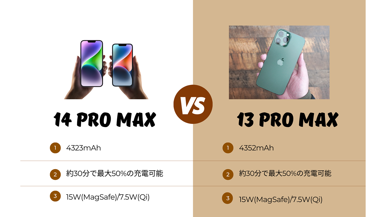 そしてバッテリーに関して前モデルは4352mAhに対してiPhone 14 Pro Maxは4323mAhと僅かに減少。Appleの公式ホームページにおいては使い方によっては改善している感じですがバッテリー容量の減少。