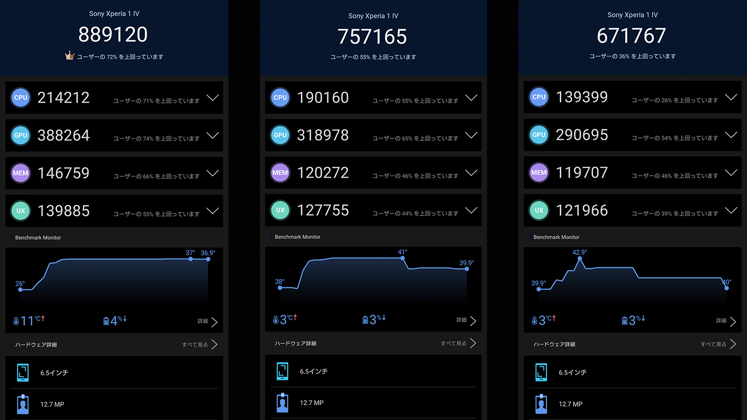Xperia 1Ⅳの方がが内部温度が上がりやすくパフォーマンスの持続性も低いです。ただiPhoneも結構熱くなるのでユーザーの使い方によっては気になるかもしれません。