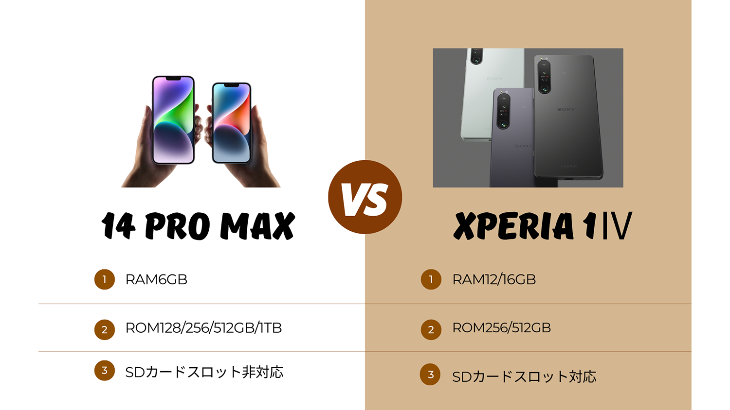 そして基礎スペックに関して搭載しているOSが違うため単純に比較できません。例えばXperia 1ⅣのRAMは12GBに対してiPhone 14 Pro Maxは6GBと半分ですがバックグランドや通知の仕様などが異なることからもRAM6GBでも十分に快適に動作します。