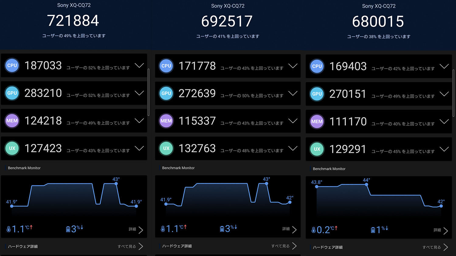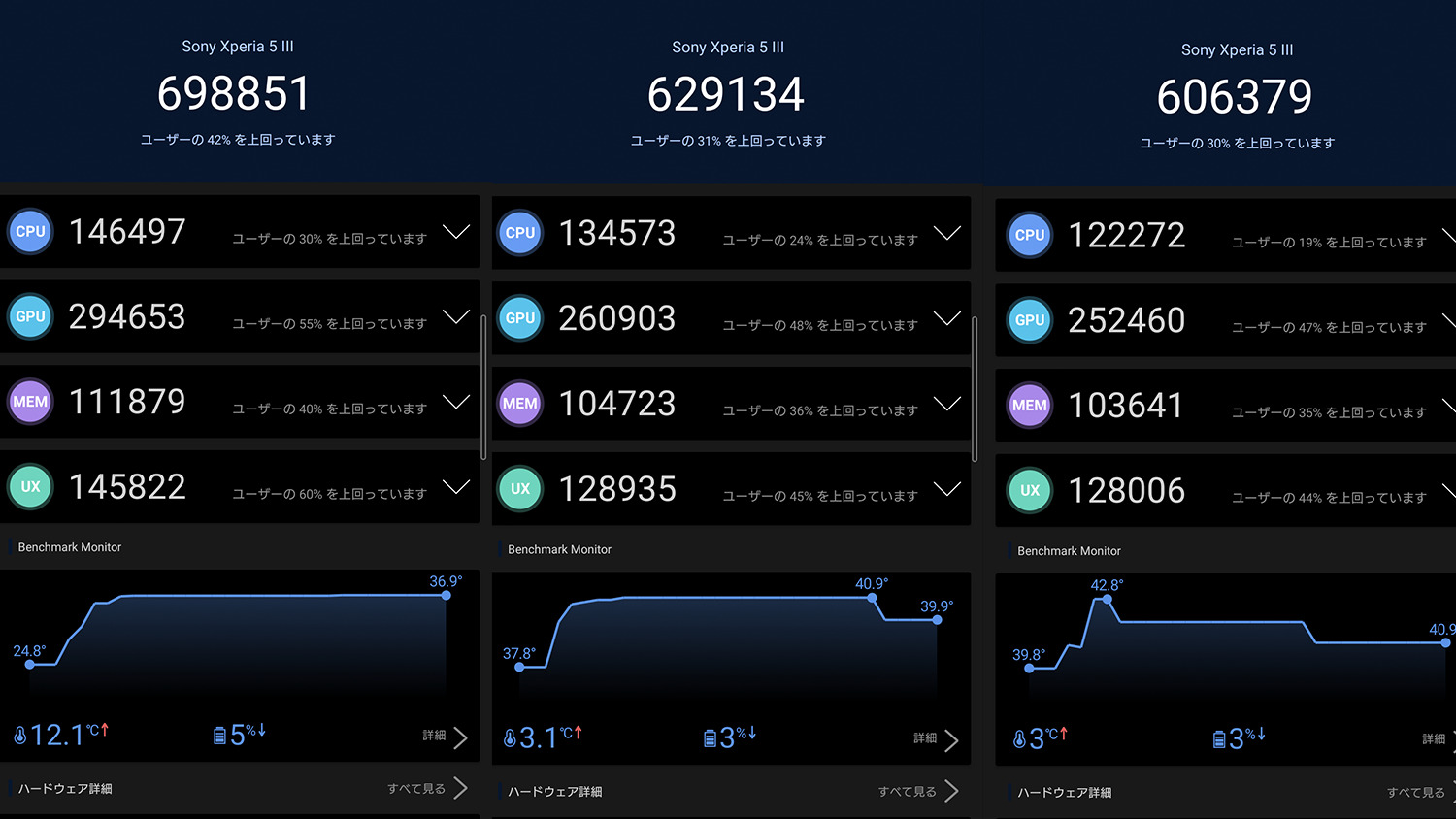内部温度を見ても43度まで上がっており熱々という感じ。ちなみにベンチマークが1回終了ごとに外部温度も計測しておりXperia 5Ⅲは38.1度/42.8度/42.7度を記録。