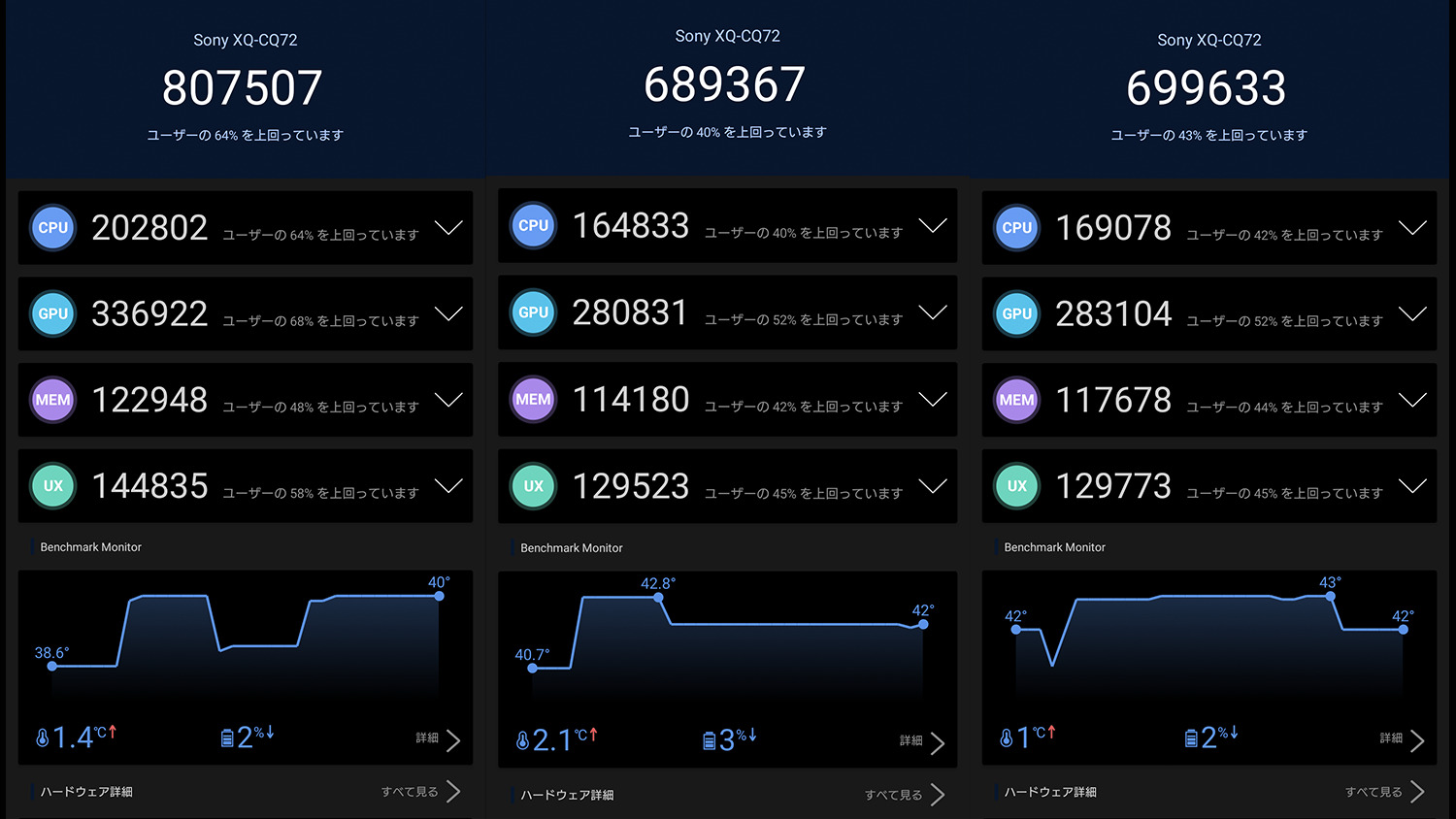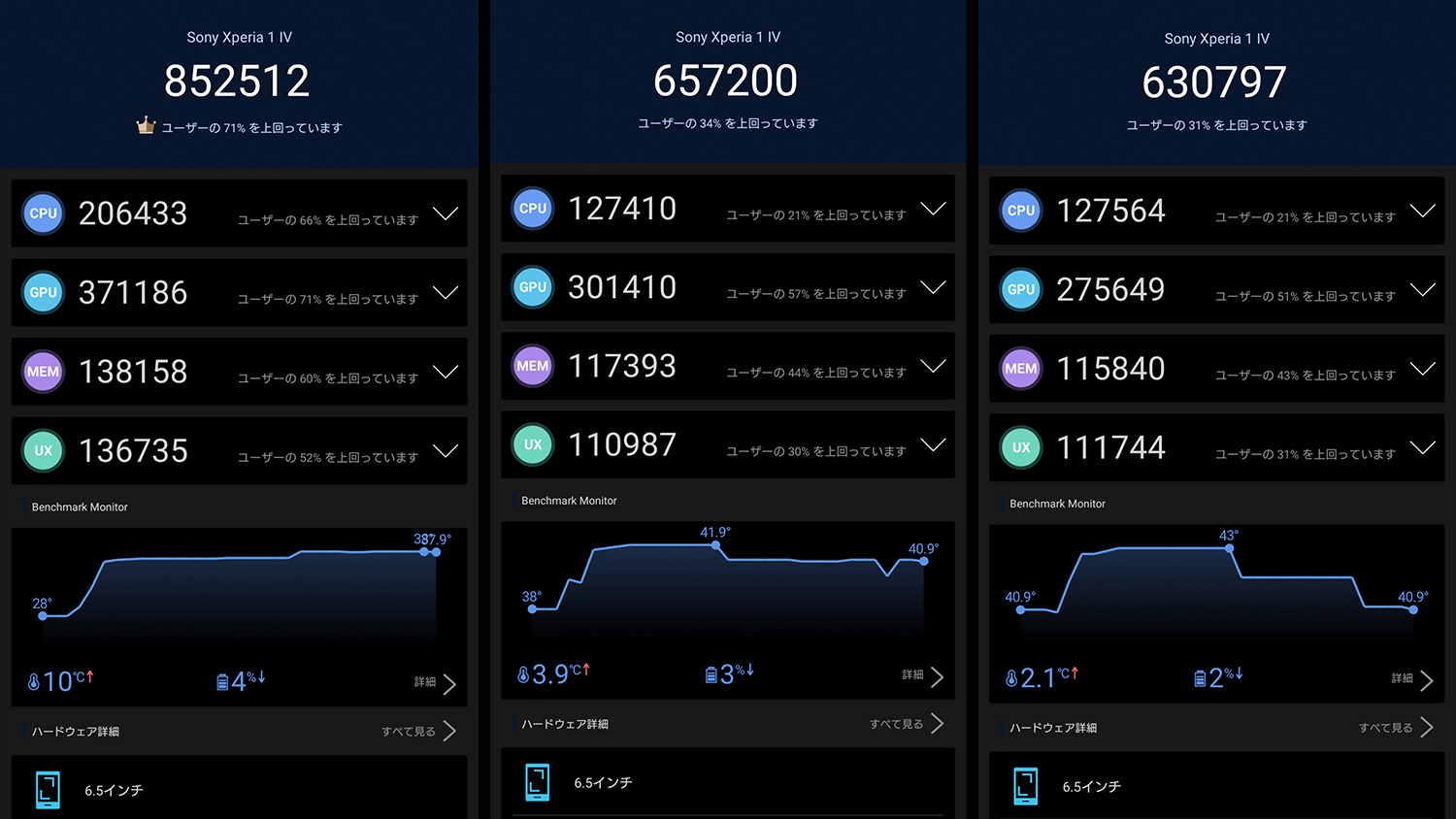 ただスコアを見てみるとXperia 1Ⅳは1回目のスコアが高いけど内部温度が上がるにつれスコアを落として最低で63万点。一方でXperia 5Ⅳは最高スコアは及ばないものの3回目のスコアが69万点と頑張って維持しています。