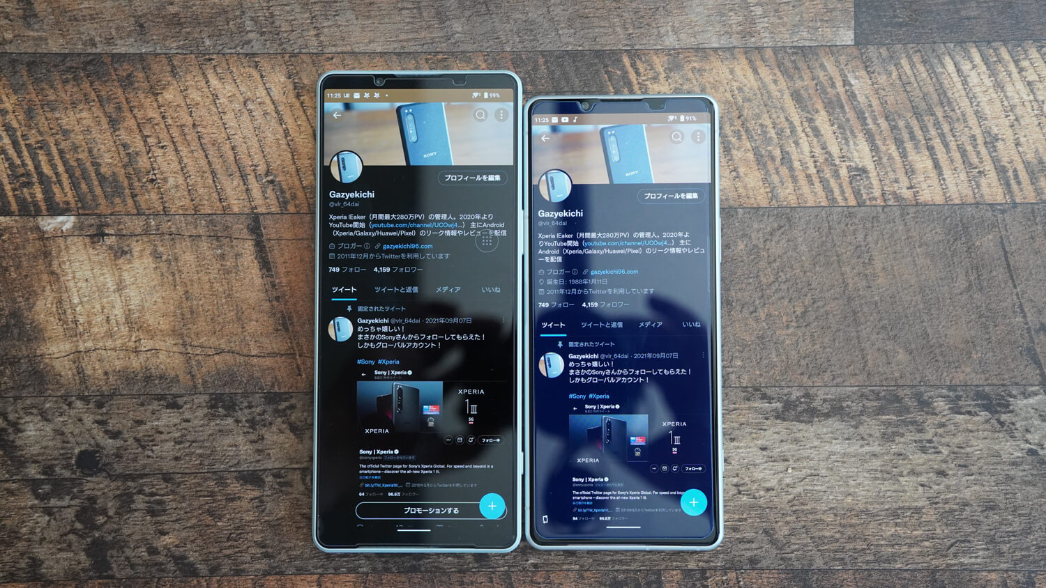 Xperia 5Ⅳは装着しているガラスフィルムの影響で映像全体が青みがかっているように見えますがXperia 1Ⅳと比較すると物足りなさを感じます。そして両機種とも大幅にディスプレイ輝度が改善。