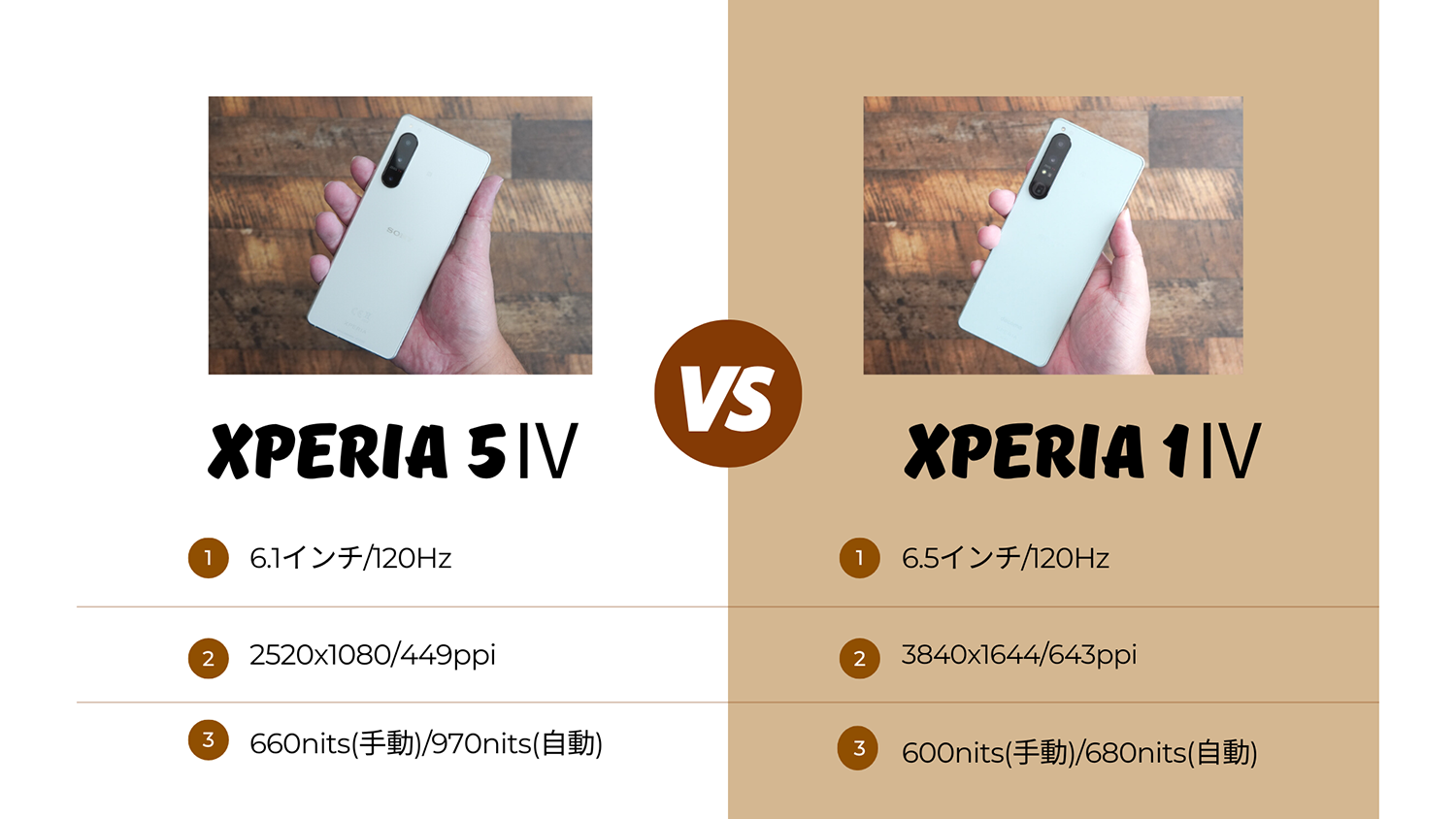 屋内で比較してみるとXperia 5Ⅳが少し明るいかなという印象で屋外で使うことが多い人は少しでも明るい方がいいと思うのでXperia 5Ⅳだと思います。アスペクト比やリフレッシュレートは一緒で単純に見やすさを求めるならXperia 1Ⅳの方が上です。
