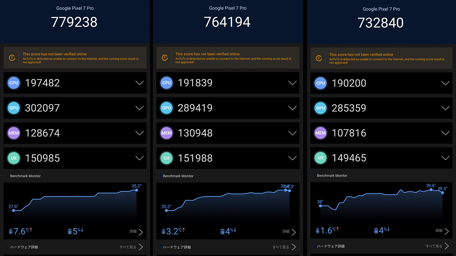 そして気になる人が多い発熱ですがベンチマークの計測が終了ごとに外部温度も計測しました。Pixel 7は34.1/38.0/38.4度に対してPixel 7 Proは36.4/37.1/36.2度という感じです。