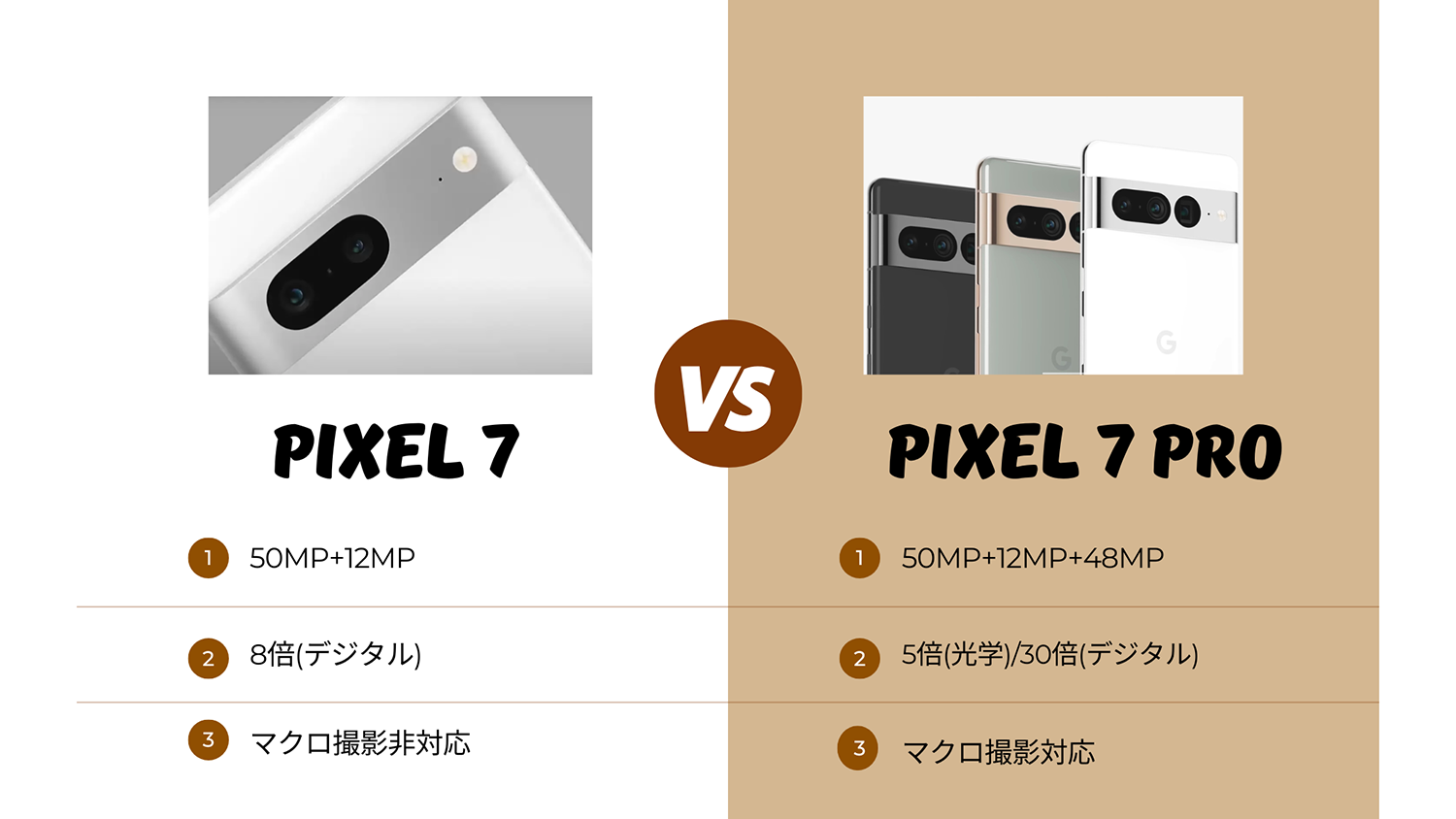最後にカメラを確認したいと思います。大きな違いとしてPixel 7 Proのみが望遠レンズを搭載。Pixel 7はデジタル8倍ズームが最大に対してPixel 7 Proは光学5倍にデジタル30倍ズームに対応。