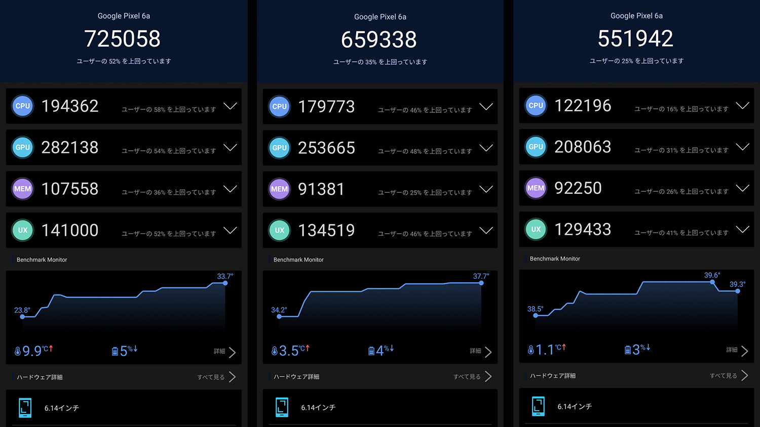 それに対してPixel 6aは3回目で55万点まで下落しているので約30%の減少になっています。内部温度的に見ればそこまで差があるわけではありませんがスコアに大きな差があります。