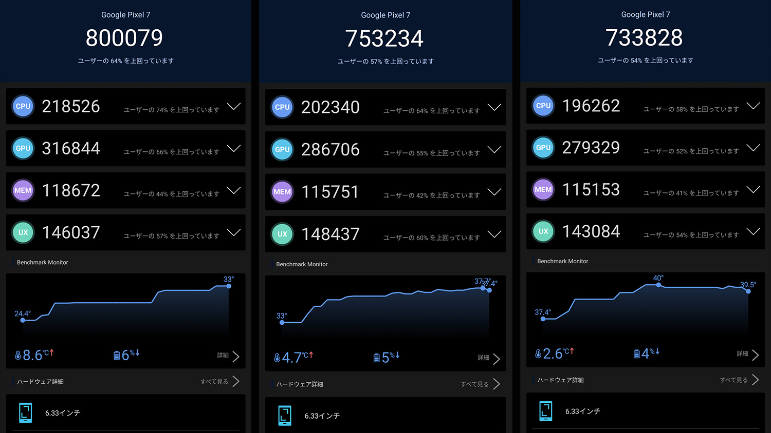 スコア的に見ればPixel 7は最高が80万点に対してPixel 6aが72万点なので丁度10%の改善。一方で気になったのはスコアでPixel 7は80万点から最終的に73万点と約10%程度の減少。