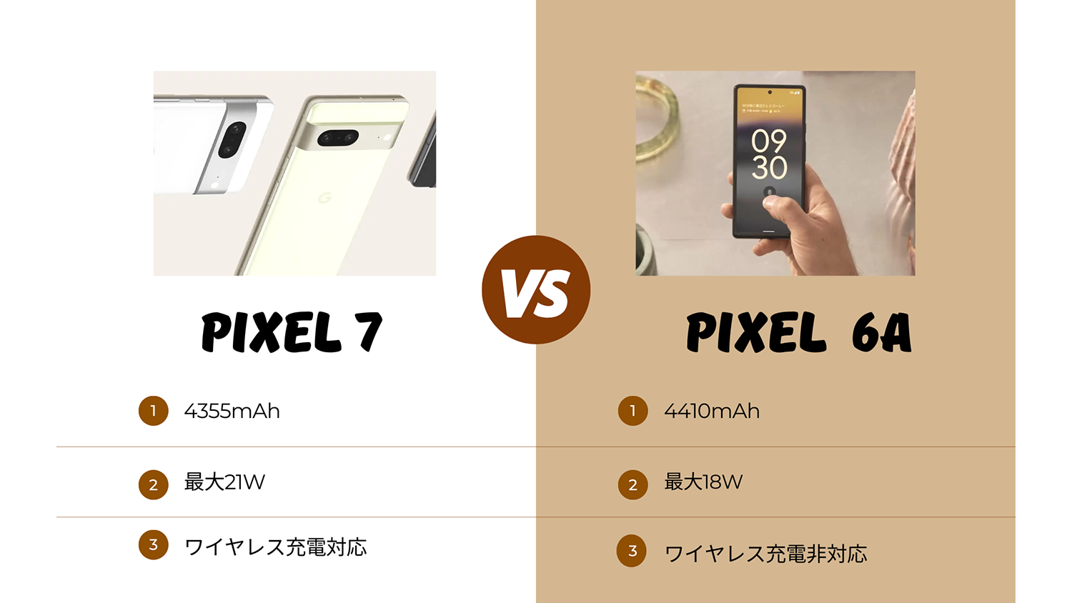 どちらの機種も電池残量に合わせて充電速度が遅くなっていくのでフル充電には2時間弱は必要です。そして地味に差があるのがPixel 7のみワイヤレス充電に対応していることですがユーザー次第。