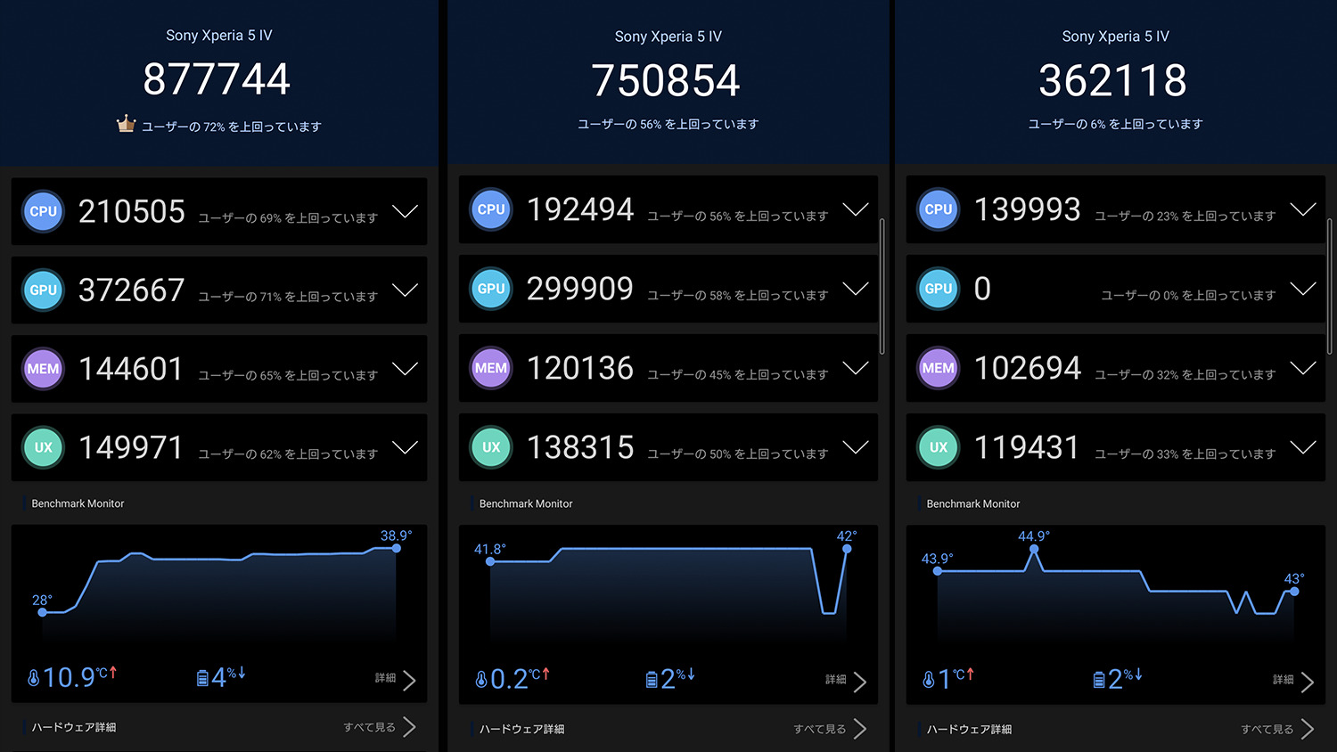 ただXperia 5Ⅳの3回目の内部温度が44度でスコアも36万点と崩壊しているので今回の結果を見る限りだとPixel 7が絶不調でしたがそれでもまだXperia 5Ⅳより安定している印象です。
