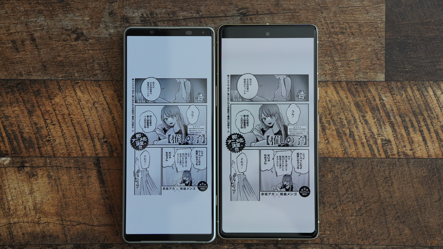 またKindleで同じページを見た時は明確に差を感じてPixel 7がデカいです。ただ余白という面ではPixel7はアスペクト比20:9にXperia 5Ⅳが21:9を採用しているためほとんど差を感じません。