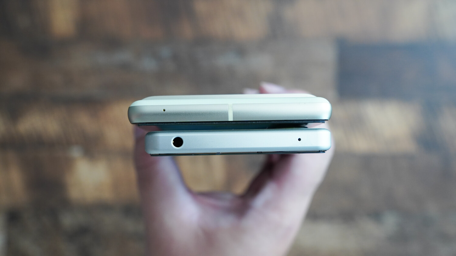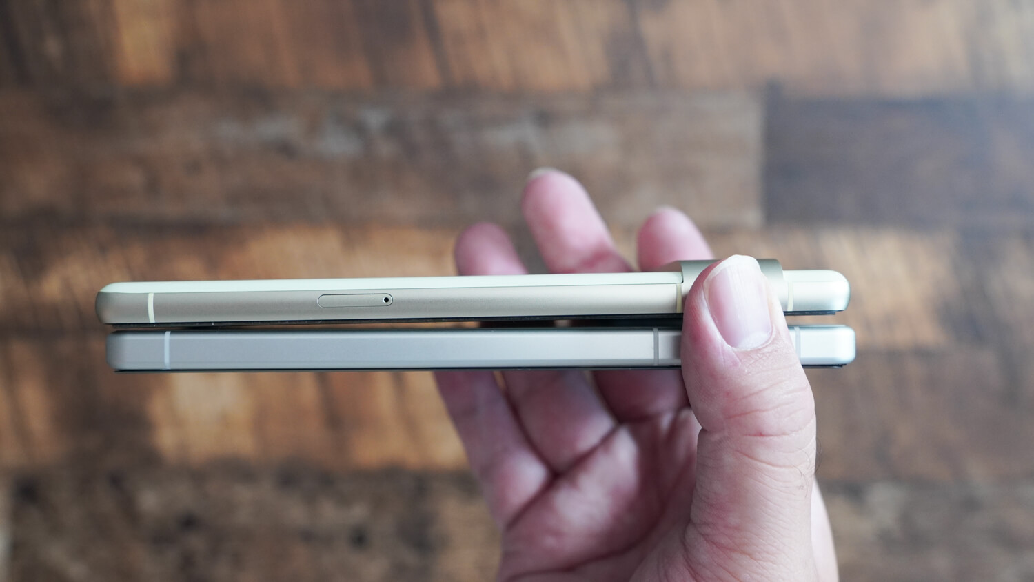 その上でデザインから確認したいと思います。縦幅に関してはほとんど一緒ですが横幅に大きな差。6mmも差があるため片手操作する際の持ちやすさは雲泥の差でXperia 5Ⅳの方が圧倒的です。
