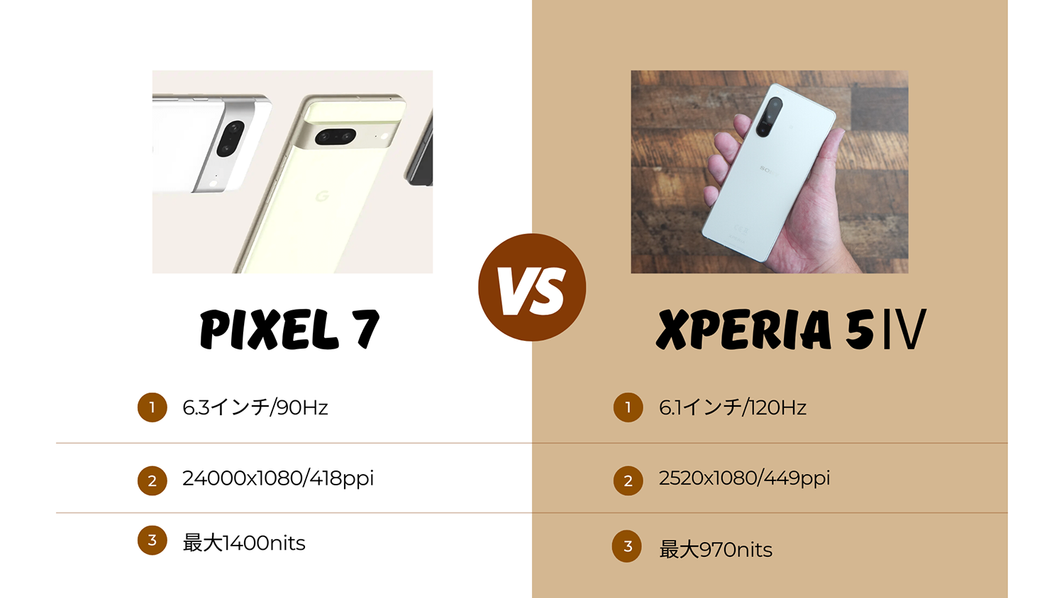 すごく分かりやすく日常的な使い方ならXperia 5Ⅳの方が明るく感じることが多い一方で晴れた日に屋外で使う場合高輝度モードに対応しているPixel 7の方が明るくなる感じです。