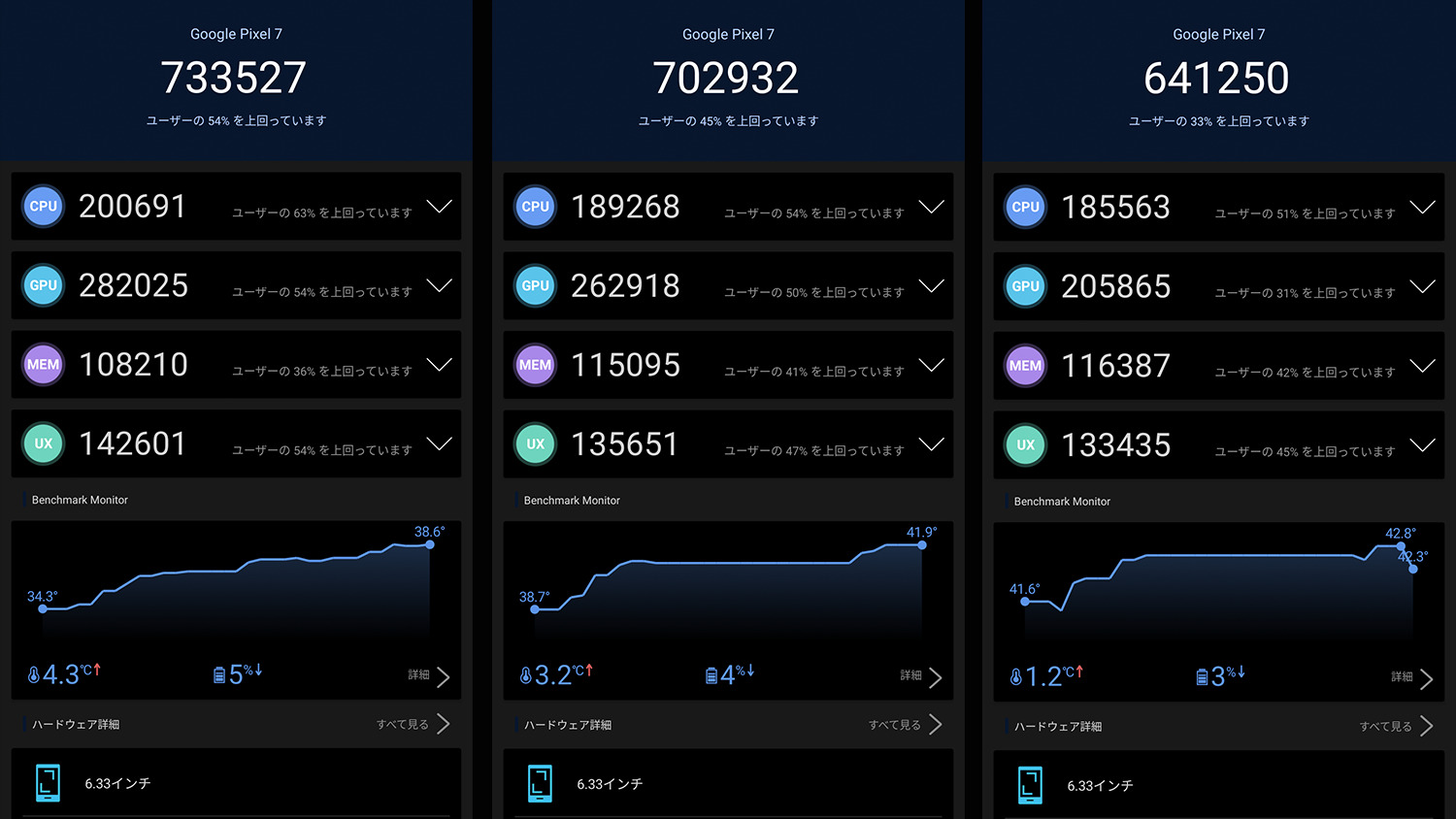 まずベンチマークに関しては今回Xperia 5Ⅳが調子がいい感じに対してPixel 7はここ数日試してきた中では最も不安定で内部温度も40度オーバーとなった結果スコアも大きく下落しています。