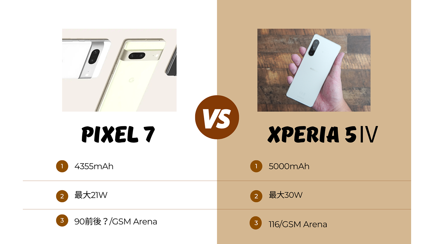 仮に90と仮定した場合はXperia 5Ⅳに遠く及ばない感じです。Pixel 7がちょっと電池持ちが悪い感じでXperia 5Ⅳが電池持ちがいい機種になるのでその差は大きいです。