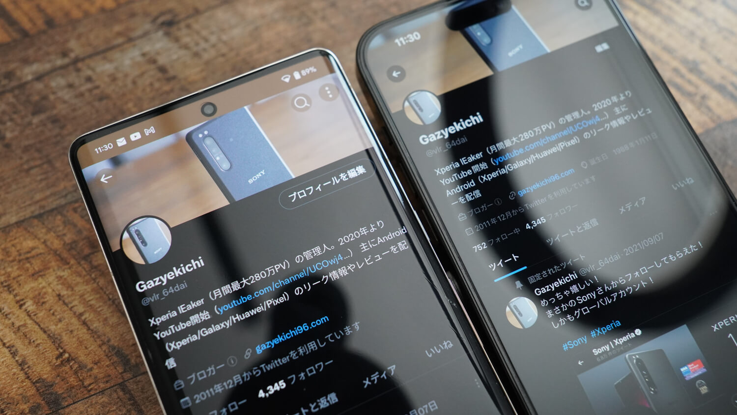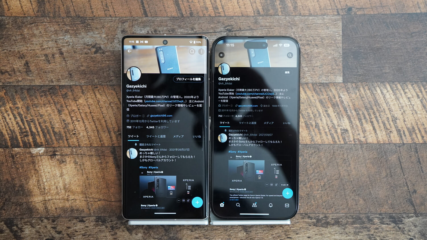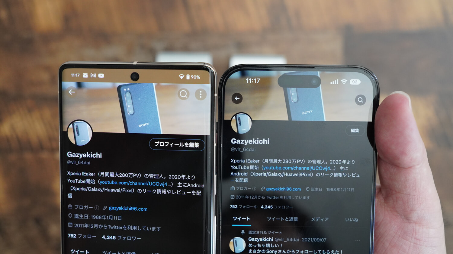 ちなみにTwitterなどを表示してみるとPixel 7 Proの方が横幅がスリムですがiPhone 14 Pro Maxの方がより狭く表示される結果一度に表示できる情報量が多いです。