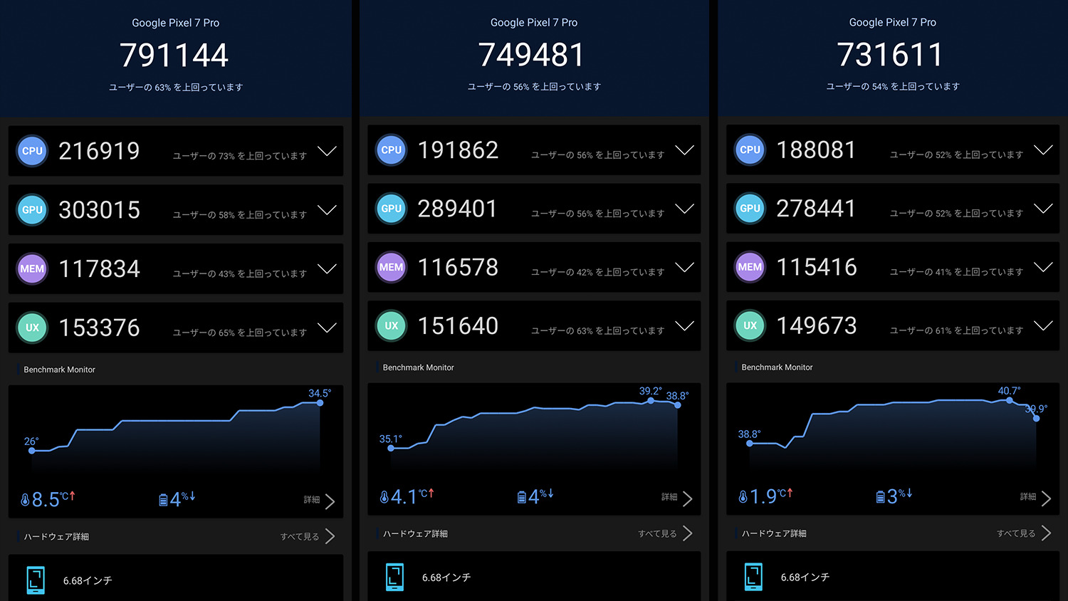 iOS用とAndroid用ではベンチマークの計測方法が異なるためスコアを比較することに意味はない。一方で計測に合わせて外部温度を計測してみましたがPixel 7 Pro34.3/36.5/37.8度。