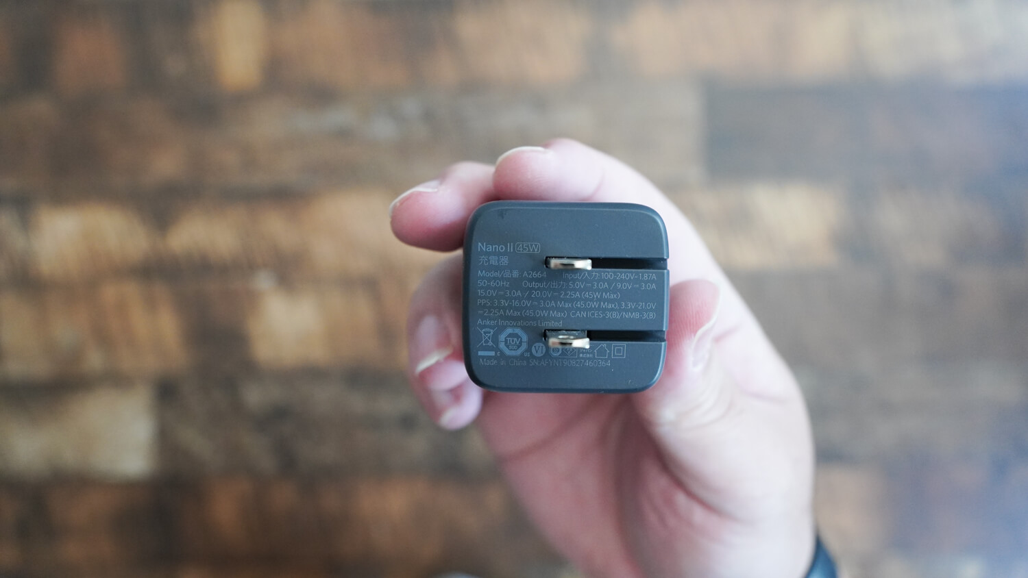 そして付属品がないことからも合わせて確認して欲しいのが電源アダプターです。自分は一度購入してから基本有線で充電する場合はAnker Nano II 45Wを使っています。