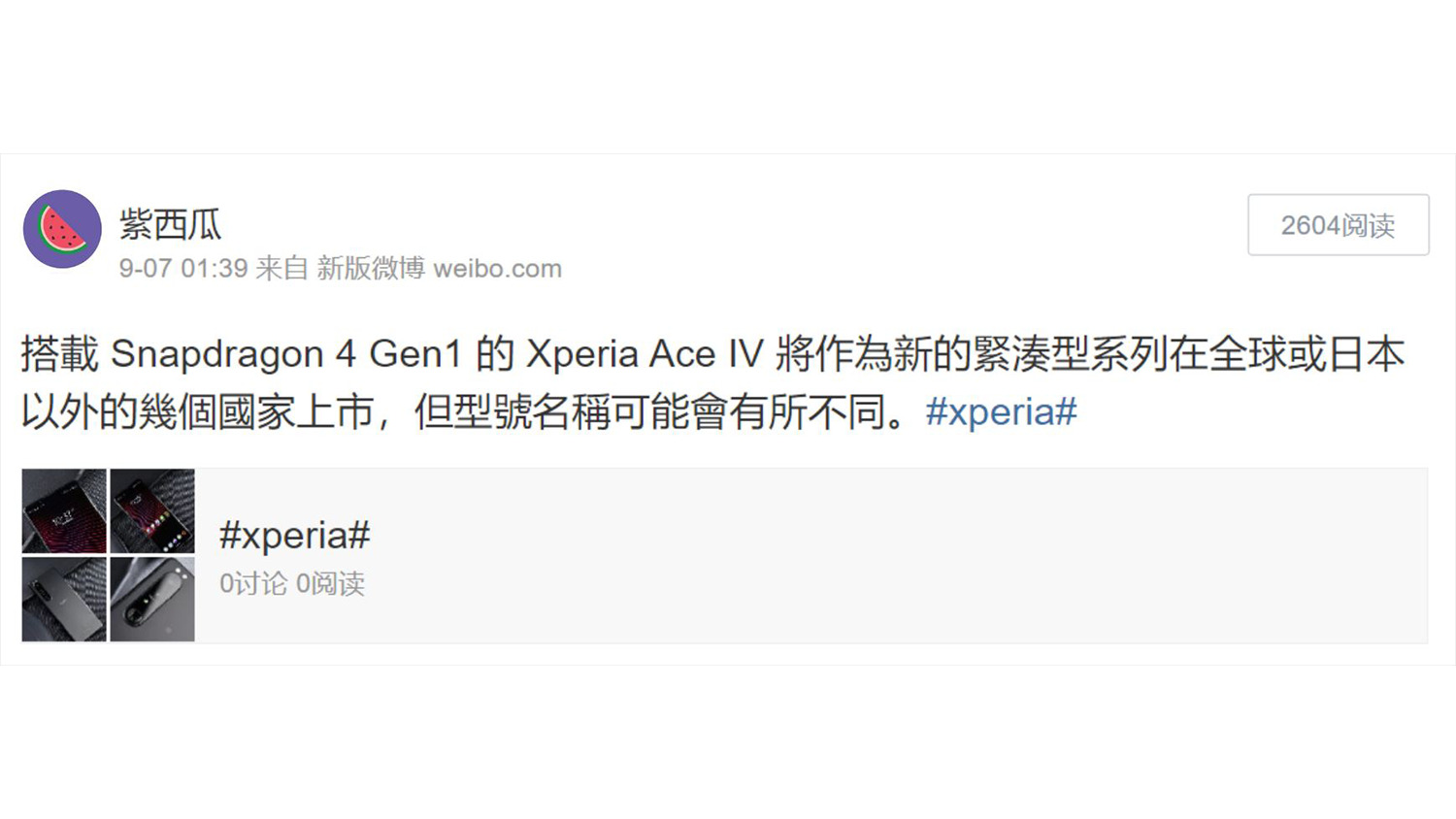 今回上記の画像がweiboに投稿されていることが判明したとしておりSnapdragon 4 Gen 1を搭載したXperia Ace Ⅳは日本市場以外でも発売される可能性があるとしています。