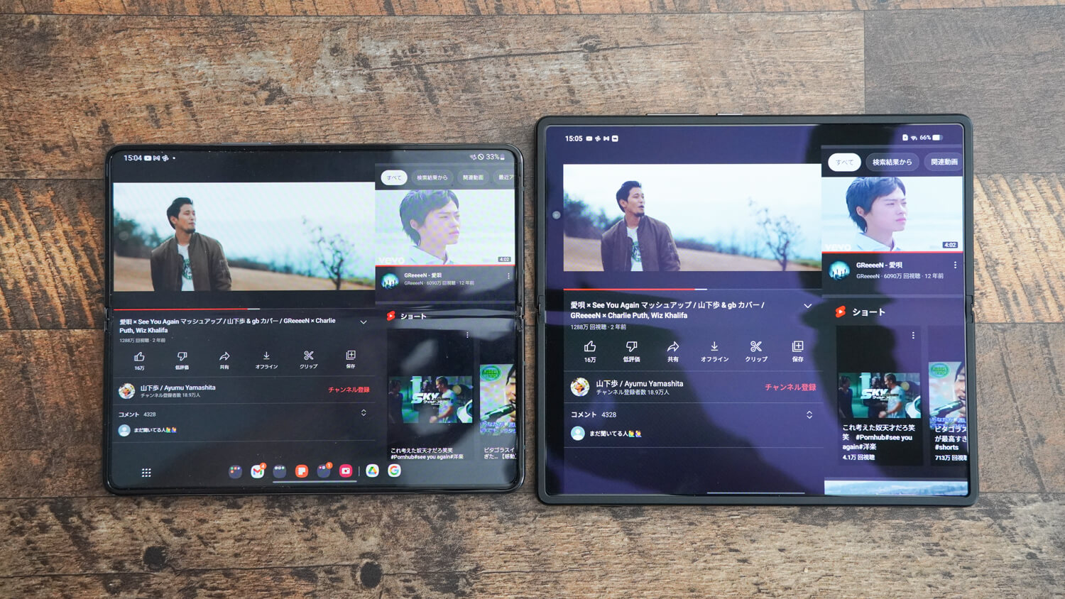 またYouTubeをGalaxy Z Fold 4と合わせて比較してみましたがサブディスプレイは明らかな差。