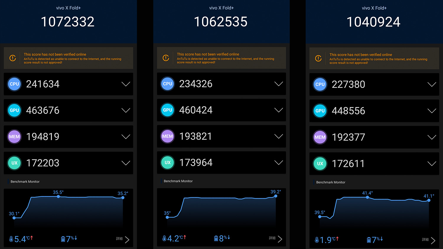 記憶違いだったら申し訳ないですがGalaxy Z Fold 4とXiaomi Mix Fold 2はメインディスプレイの方でしかベンチマークを計測できなかったと思いますがVivo X Fold+はサブディスプレイの方でも計測できたので今回は閉じた状態で計測した感じになります。