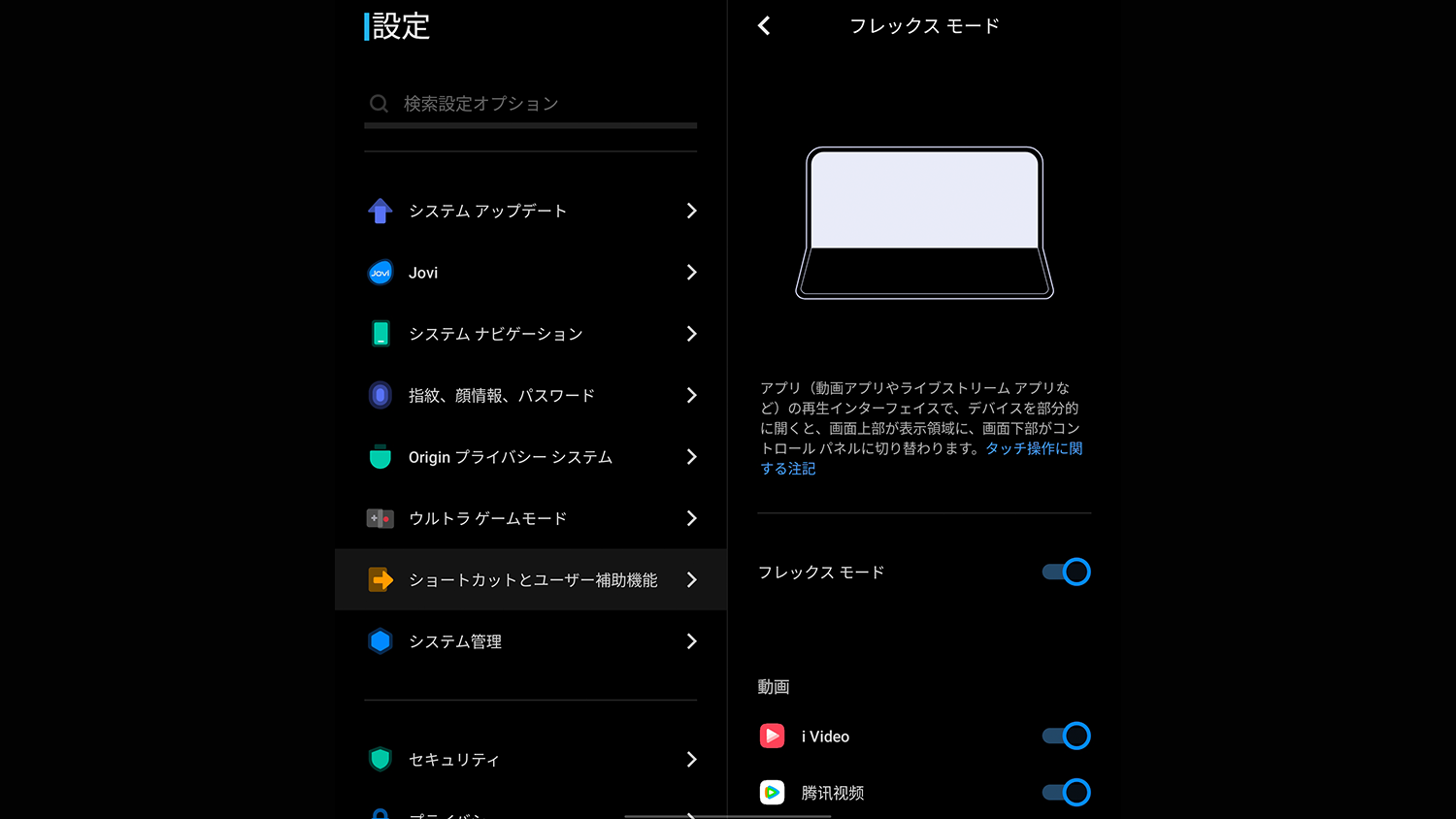ちなみにフレックスモードにも対応しており本体の設定から対応アプリを確認できます。ただ自分が使っているアプリはなく基本中国系のアプリのみ。